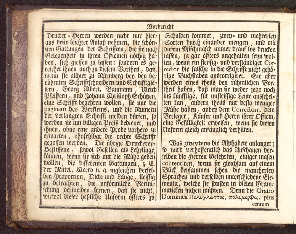 Die Wol-eingerichtete Buchdruckerey : mit hundert und ein und zwanzig Teutsch- Lateinisch- Griechisch- und Hebräischen Schrifften, vieler fremden Sprachen Alphabeten, musicalischen Noten, Calender-Zeichen, und Medicinischen Characteren, Jngleichen allen üblichen Formaten bestellet, und mit accurater Abbildung der Erfinder der löblichen Kunst, nebst einer summarischen Nachricht von den Buchdruckern in Nürnberg ausgezieret ; Am Ende sind etlichen kurz-gefasste Anmerckungen von der Hebräischen Sprach angefüget / [Joh. Heinrich Gottfried Ernesti]