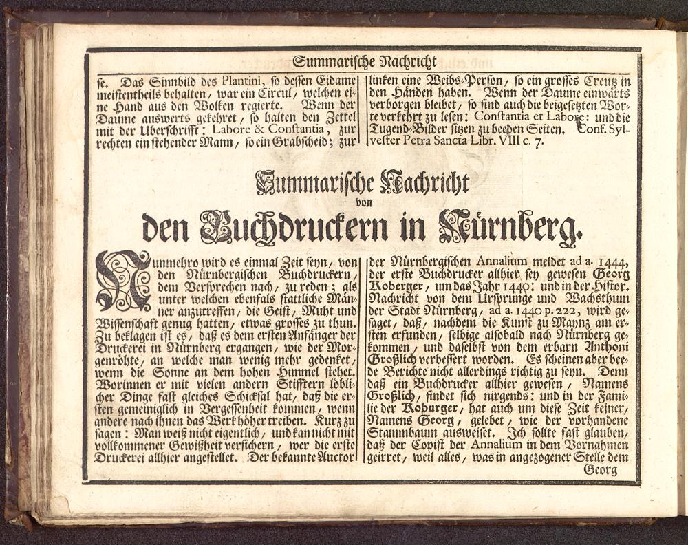 Die Wol-eingerichtete Buchdruckerey : mit hundert und ein und zwanzig Teutsch- Lateinisch- Griechisch- und Hebräischen Schrifften, vieler fremden Sprachen Alphabeten, musicalischen Noten, Calender-Zeichen, und Medicinischen Characteren, Jngleichen allen üblichen Formaten bestellet, und mit accurater Abbildung der Erfinder der löblichen Kunst, nebst einer summarischen Nachricht von den Buchdruckern in Nürnberg ausgezieret ; Am Ende sind etlichen kurz-gefasste Anmerckungen von der Hebräischen Sprach angefüget / [Joh. Heinrich Gottfried Ernesti]