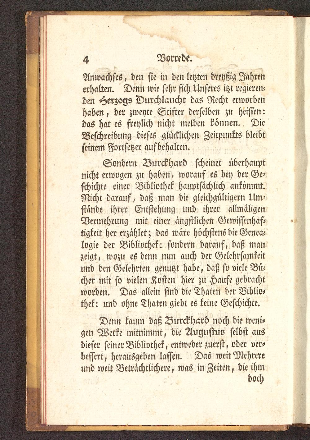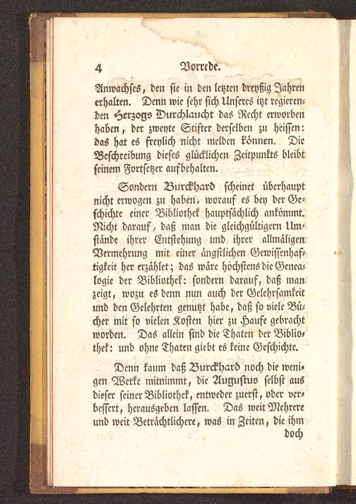 Denn kaum daß Burckhard noch die weni-gen Werke mitnimmt, die Augustus selbst ausdieser seiner Bibliothek, entweder zuerst, oder ver-bessert, herausgeben lassen. Das weit Mehrereund weit Beträchtlichere, was in Zeiten, die ihm