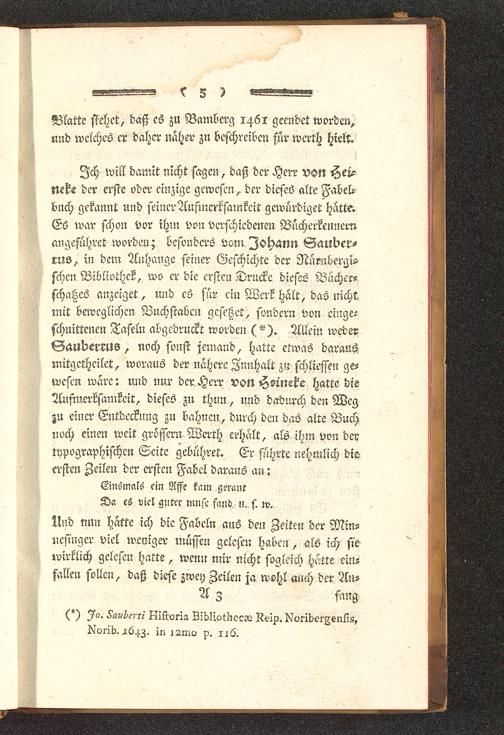 Ich will damit nicht sagen, daß der Herr von Hei?neVe der erste oder einzige gewesen, der dieses alte Fabel-buch gekannt und seiner Aufmerksamkeit gcwürdiget hatte.Es war schon vor ihm von verschiedenen Bücherkemiernangeführet worden; besonders vom Johann Sauber-eus, in dem Anhange seiner Geschichte der Nürnberg !-,sehen Bibliothek, wo er die ersten Drucke dieses Bücher-schatzcS anzeiget, und es für ein Werk halt, das nicht,mit beweglichen Buchstaben gcseßet, sondern von cinge-schnittcnen Tafeln abgedruckt worden (^). 2lllein wederGauberms, noch sonst jemand, hatte etwas darausmitgetheilet, woraus der nähere Znnhalt zu schließen ge-wesen wäre: und nur der.Herr von Hsineke hatte dieAuftuerksamkeit, dieses zu thun, und dadurch den Wegzu einer' Entdeckung zu bahnen, durch deu das alte Buchuoch einen weit grösscrn Werth erhalt, als ihm von dertypographischen Seite gebühret. Er führte nehmlich dieersten Zeilen der ersten Fabel daraus an:Ewsmals ein Affe kam gerantDa es viel gutcr imisc fand n. s. w.