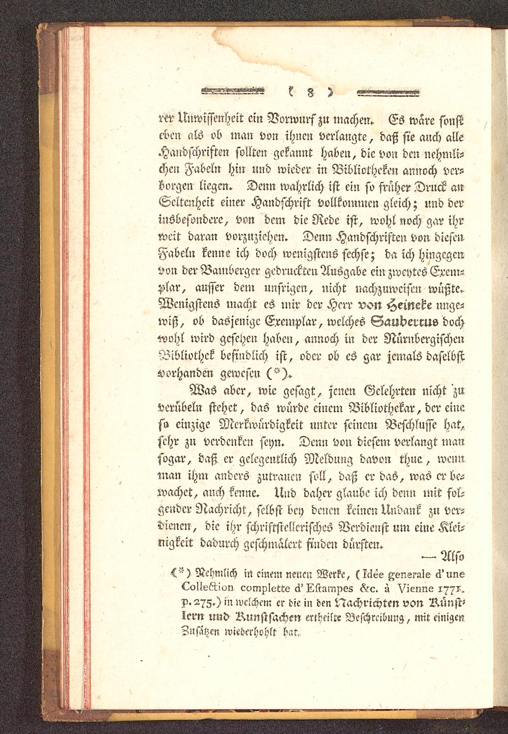 rer Unwissenheit ein Vorwurf zu machen. Eö wäre sonstlben als ob mm: von ihnen verlangte, daß sie auch alle.Handschriften sollten gekannt haben, die von den nehmli-chen Fabeln hin und wieder in Bibliotheken annoch ver-borgen liegen. Denn wahrlich ist ein so früher Druck auSeltenheit eiuer Handschrift vollkommen gleich; und derinsbesondere, von dem die Rede ist, wohl noch gar ihrweit daran vorzuziehen. Denn Handschriften von diefeuFabeln kenne ich doch wenigstens scchft; da ich hingegenvon derBambergcr gedruckten Ausgabe ein zweytes Exem-plar, ausser dem unsrigen, nicht nachzuweisen wüßtc^Wenigstens macht es mir der Herr von Heineke unge-wiß, ob dasjenige EMMplar, welches Sauberm« dochnohl wird gcscycn haben, annoch in der NürnbergischenBibliothek befindlich ist, oder ob es gar jemals daselbstvorhanden gewesen (^).