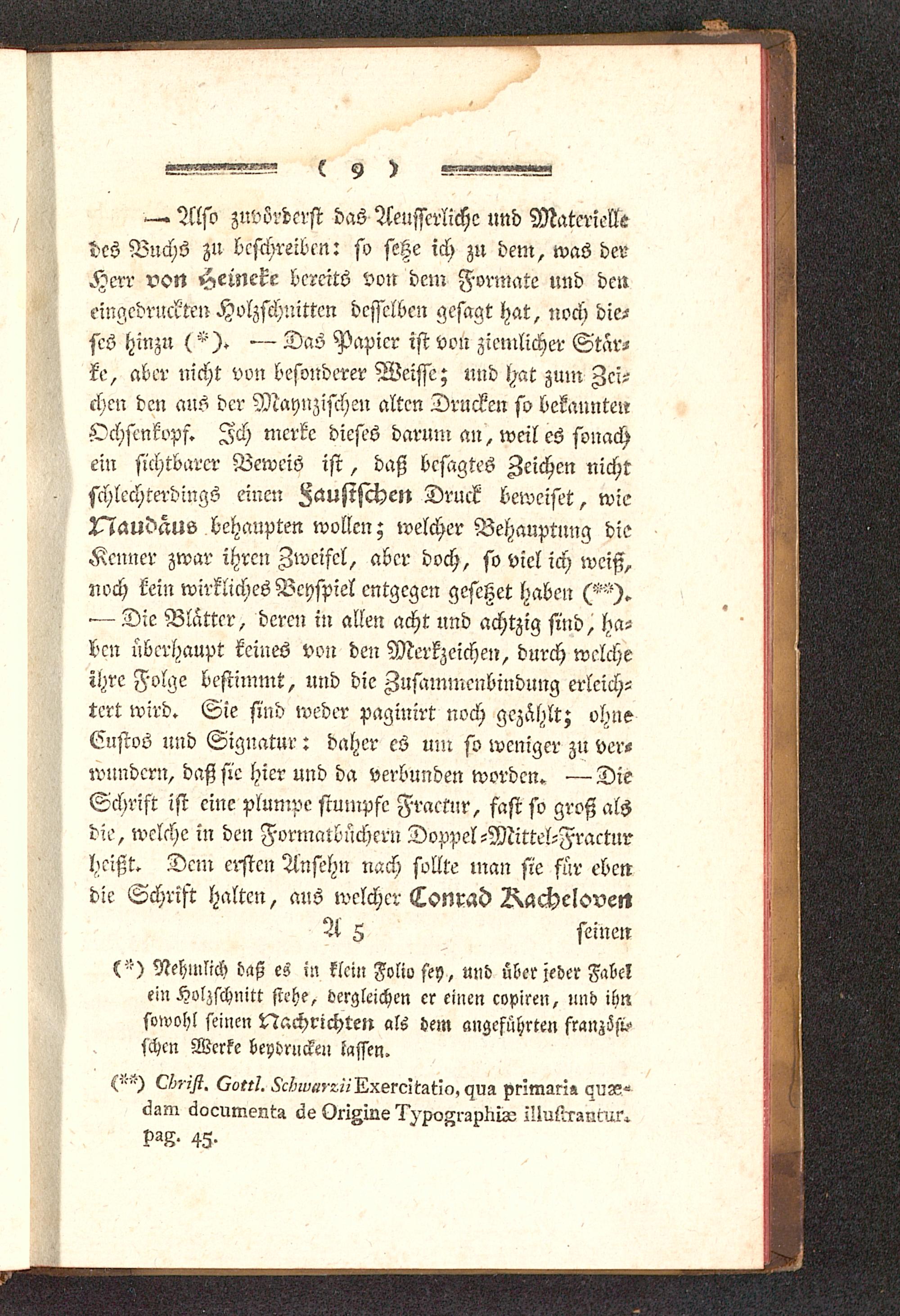 — Also zuvörderst das Aeusscrlichc und Materielledes VuchS zu beschreiben: so setze ich zu dem, was derHerr von Heinekc bereits von dem Formate und deneingedruckten Holzschnitten desselben gesagt hat, noch die-ses hinzu (— Das Papier ist von ziemlicher Star-ke, aber nicht von besonderer Weissc; und hat zum Zei-chen den ans der Maynzischen alten Drucken so bekannte»Ochsenkopf. Ich merke dieses darum an, weil es sonachein sichtbarer Beweis ist, daß besagtes Zeichen nichtschlechterdings einen Fausifthen Druck beweiset, wieZ^audäus behaupten wollen; welcher Behauptung dieKenner zwar ihren Zweifel, aber doch, so viel ich weiß,noch kein wirkliches Beyspiel entgegen geseßet haben ('^).— Die Blatter, deren in allen acht und achtzig sind, ha-ben überhaupt keines von den Merkzeichen, durch welcheihre Folge bestimmt, und die Zusammenbindung erleich-tert wird» Sie sind weder paginirt noch gezählt; ohneGistos und Signatur: daher es um so weniger zu ver-wundern, daß sie hier und da verbunden worden. — DieSchrift ist eine plumpe stumpfe Fractnr, fast so groß alsdie, welche in den Formalbnchcrn Doppel-Mittel-Fraeturheißt. Dem ersten Ansehn nach sollte man sie für ebendie Schrift halten, aus welcher Lonrad Zxachclovett