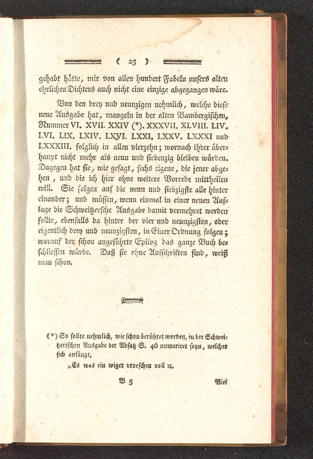 Von den drey und nennzigcn nehmlich, welche dieseneue Ausgabe hat, mangeln in der alten Bambergischen,Nummer VI. XVII. XXIV (*).XXXV!I. XIVlII. I.IV.I.VI. ux. I^XIV. I.X.VI. I.XXI. I.XXV. I.XXXI undI^XXXIII. folglich in allen vierzehn; wornach ihrer über-haupt nicht mehr als neun und siebenzig bleiben würden»Dagegen hat sie, wie gesagt, sechs eigene, die jener abge-hen , und die ich hier ohne weitere Vorrede mittheilenwill. Sie folgen auf die neun und siebzigste alle hintereinander; und müssen, wenn einmal in einer neuen Aus-lage die Schweitzersche Ausgabe damit vermehret werdensollte, ebenfalls da hinter der vier und neunzigsten, odereigentlich drey und neunzigsten, in Einer Ordnung folgen;worauf der schon angeführte Epilog das ganze Buch be-schlossen würde. Daß sie ohne Aufschristen sind, weißmau schon.