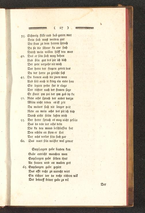 Empfangen gäbe binden kanGabe entricht manchen manEmpfangen gäbe selben thutAn stauen nnd an maiien gut65. Empfangen gäbe gcpirtDas offt recht zu unrecht WirtEin richter der do recht richten wi?Der bedarff keiner gäbe zu vil