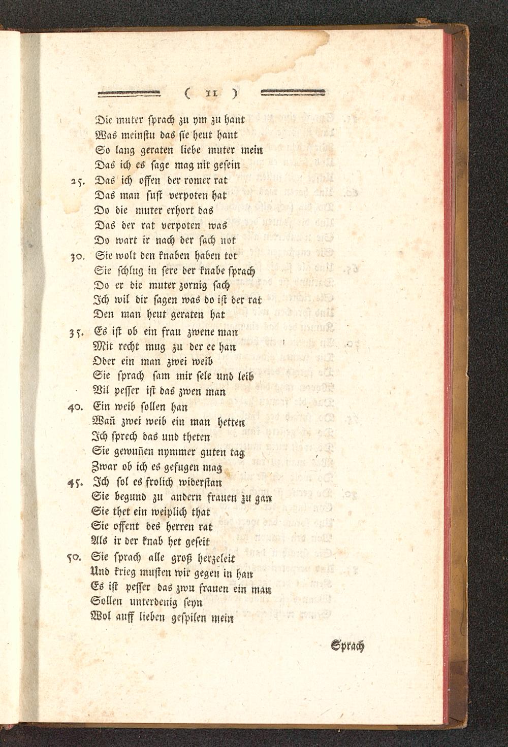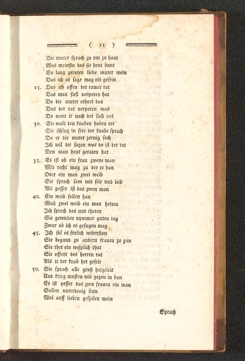 Die muter sprach zu ym zu hautWas meinst» das sie heut hautSo laug geraten liebe muter meinDas ich es sage mag nit gesemz s. Das ich offen der romcr ratDas man sust verpoteu hat!Do die muter erhört dasDas der rat verpoten wasDo wart ir nach der sach notSie wolt den knaben haben torSie schlug in sere der knabe sprachDo er die muter zornig sachIch wil dir sagen was do ist der ratDen man heut geraten hat