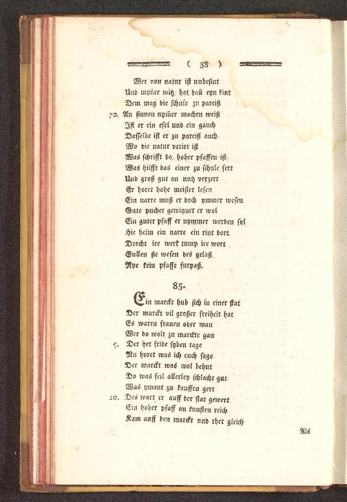 Wer von mtur ist unbcsintUnd myner Witz hat hau cyn kinrDem mag die schule zu parciß70. An sinnen nymer machen weißIst er ein escl und ^cin ganchDasselbe ist er zu parciß auchWo die natur vcrirt istWas schrifft do. hoher pfaffen ist/Was hilfft das einer zu schule fertUnd groß gut an nutz verzertEr höret hohe mcister lesenEin narre muß er doch ymmer wesenGute pucher gewinnet er wolEin guter pfaff er nymmer werden solHie heim ein narre ein rint dortDorcht ire werk tump ire wvrt ^Süllen sie wesen des gelaßNye kein pfassc fnrpaß.