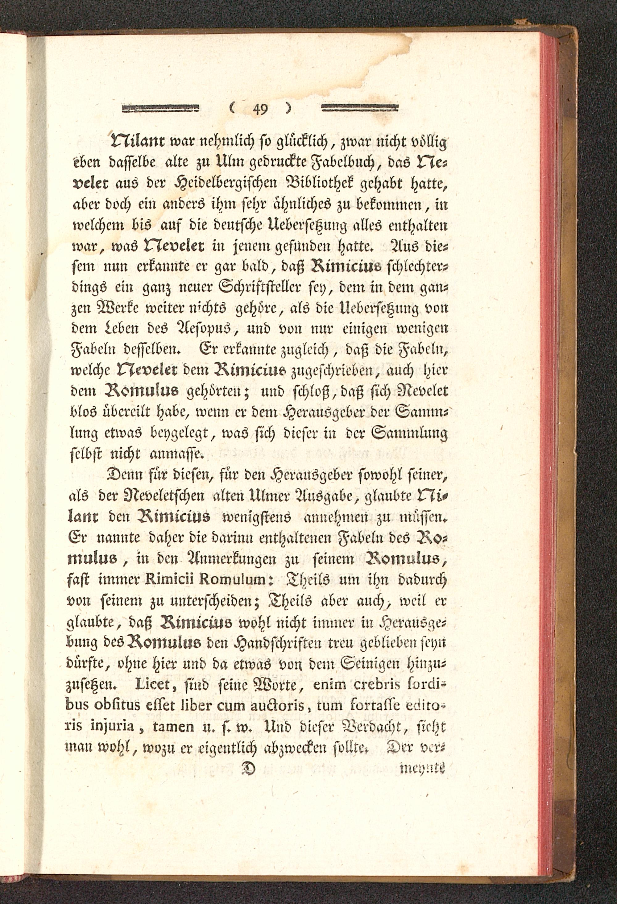 !7Manr war nehmlich so glücklich, zwar nicht völligeben dasselbe alte zu Ulm gedruckte Fabelbuch, das Ne-Veler aus der Heidclbcrgischen Bibliothek gehabt hatte,aber doch ein anders ihm sehr ähnliches zu bekommen, inwelchem bis auf die deutsche Ueberseßnng alles enthaltenwar, was Neveler iu jenem gesunden hatte. Aus die-sem nun erkannte er gar bald, daß Rimiciuo schlechter-dings ein ganz neuer Schriftsteller sey, dem in dem gan-zen Werke weiter mchts gehöre, als die Ueberseßung vondem ^eben des Aesvpus, und von nur einigen wenigenFabeln desselben. Er erkannte zugleich , daß die Fabeln,welche Neveler dem Rimiciue zugeschrieben, auch hierdem Romulus gehörten; und schloß, daß sich Nevcletblos übereilt habe, wenn er dem Herausgeber der Samm-lung etwas beygelegt, was sich dieser in der Sammlungselbst nicht anmasse.