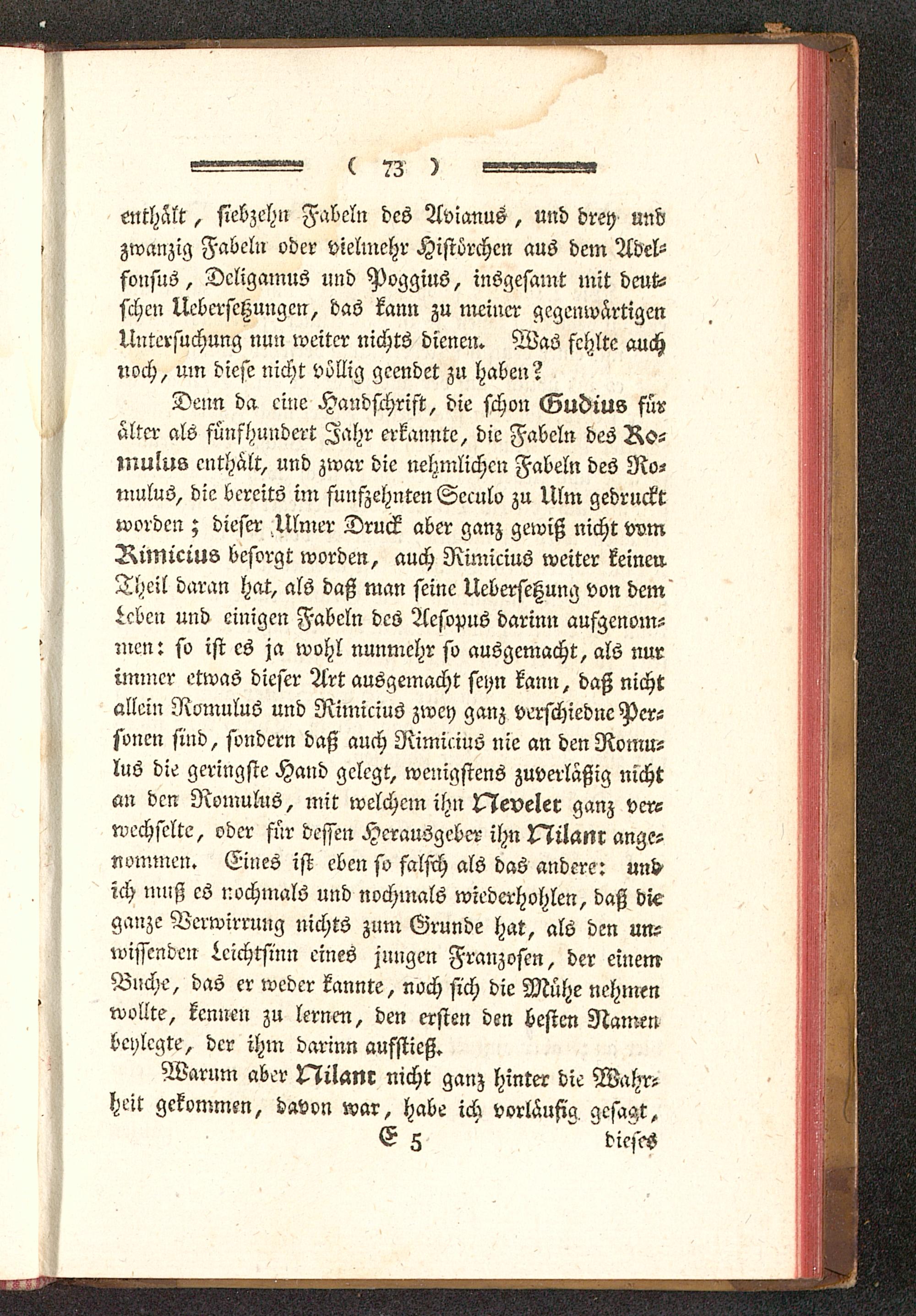 Denn da eine Handschrift, die schon Gudius fürälter als fünfhundert Jahr erkannte, die Fabeln des Ro-mulus enthält, und zwar die nehmlichen Fabeln des Ro-niulus, die bereits im fünfzehnten Scculo zu Ulm gedrucktworden ; dieser Ulmer Druck aber ganz gewiß nicht vvmRimicius besorgt worden, auch Rimicius weiter keineu-Theil daran hat, als daß man seine Übersetzung von demLeben und einigen Fabeln des Aesopus darinn aufgenom-men: so ist es ja wohl nunmehr so ausgemacht, als nurimmer etwas dieser Art ausgemacht seyn kann, daß nichtallein Romulus und Rimicius zwey ganz verschiednc Per-sonen sind, sondern daß auch Rimicius nie an den Romu-lus die geringste Hand gelegt, wenigstens zuverlaßig nichtan den Romulus, mit welchem ihn Neveler ganz ver-wechselte, oder für dessen Herausgeber ihn Z7?ilanr angc-nommen. Eines ist eben so falsch als das andere: undich muß es nochmals und nochmals wiedcrhohlen, daß dieganze Verwirrung nichts zum Grunde hat, als den un-wissenden Leichtsinn eines jungen Franzosen, der einemBuche, das er weder kannte, noch sich die Mühe nehmenwollte, kennen zu lernen, den ersten den besten Namenbeylegte, der ihm darinn aufstieß.