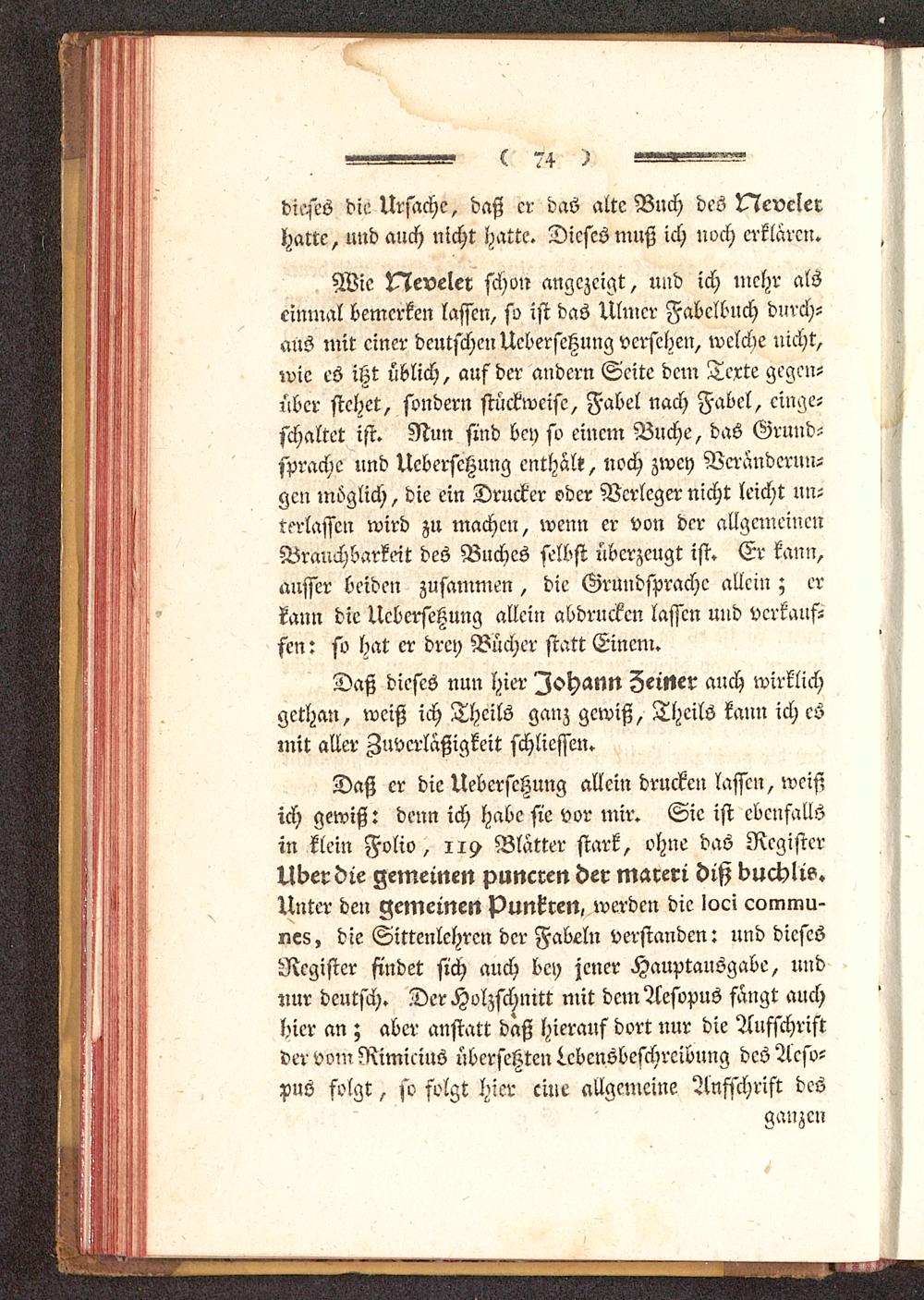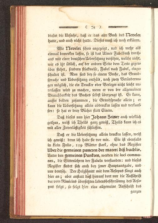 Daß er die Übersetzung allein drucken lassen, weißich gewiß: denn ich habe sie vor mir. Sie ist ebenfallsin klein Folio, 119 Blätter stark, ohne das RegisterÜber die gemeinen puncrcn der mareri diß buchlis.Unter den gemeinen Punkren, werden die loci commu-nes, die Sittcnlchrcn der Fabeln verstanden: und diesesRegister findet sich auch bey jener Hauptausgabe, uudmw deutsch . Der Holzschnitt mit dem Aesopus fängt auchhier an ; aber anstatt daß hierauf dort nur die Aufschriftder von, Rimieius übersetzten i.cbensbeschreibung des Acso-PUs folgt, so folgt hier cme allgemeine Ansschrifr des