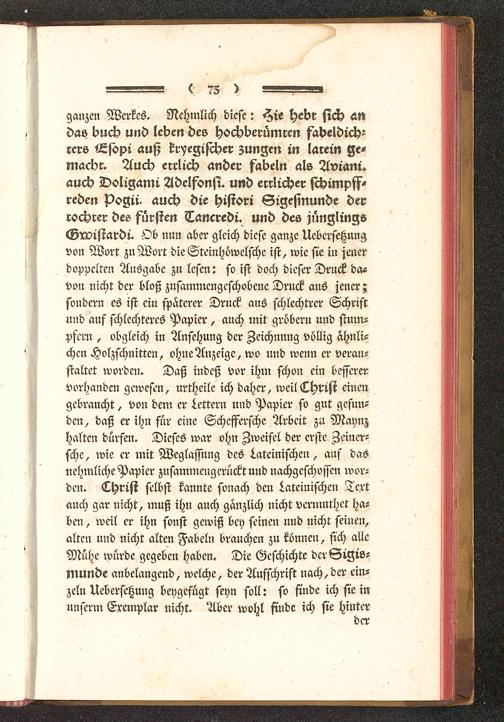 ganzen Werkes. Nehmlich diese: Hie hebt sich <mdas buch und leben des hochberümrcn fabeldich-rers tLjopi auß kryegifther Zungen in larein ge-macht. Auch crrlich ander fabeln als Aviani.auch Doligami Adelfonsi. und errlicher fthimpff-reden Pogii- auch die histori Sigejmunde derrochrer deo fürsten Tancredi. und des jünglingsGrvistardi. Ob nun aber gleich diese ganze Uebersetzungvon Wort zu Wort dieSteinhöwelsche ist, wie sie in jenerdoppelten Ausgabe zu lesen: so ist doch dieser Druck da-von nicht der bloß zusammengeschobene Druck aus jener;sondern es ist ein spaterer Druck aus schlechterer Schriftund auf schlechteres Papier , auch mit gröbcrn und stum-pfern , obgleich in Ansehung der Zeichnung völlig ähnli-chen Holzschnitten, ohne Anzeige, wo und wenn er veran-staltet worden. Daß indeß vor ihm schon ein besserervorhanden gewesen, urtheile ich daher, weil Christ einengebraucht, von dem er wettern und Papier so gut gefun-den, daß cr ihn für eine Schcffersche Arbeit zu Maynzhalten dürfen. Dieses war ohn Zweifel der erste Zeiner-sche, wie cr mit Wcglassnng des Lateinischen, auf dasnehmliche Papier zusammengerückt und nachgeschossen wor-den. Christ selbst kannte sonach den Lateinischen Textauch gar nicht, muß ihn auch ganzlich nicht vermnthet ha-ben , weil er ihn sonst gewiß bey seinen und nicht seinen,alten und nicht alten Fabeln brauchen zu könneu, sich alleMühe würde gegeben haben. Die Geschichte dcrSigis-MUNde anbelangend, welche, der Aufschrift nach, der ein-zeln Uebersctzung beygefügt seyn soll: so finde ich sie in