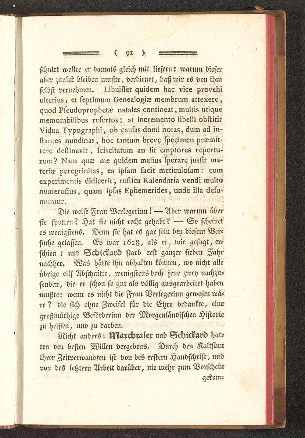 Die weise Frau Verlegerinn! — ?tbcr warum übersie spotten? Hat sie nicht recht gehabt? — So scheinetes wenigstens. Denn sie hat es gar fein bey diesem Ver-suche gelassen. Es war 1628, als er, wie gesagt, er-schien : und Schickard starb erst ganzer sieben Jahrnachher. Was hatte ihn abhalten können, wo uicht alleübrige cilf Abschnitte, wenigstens doch jene zwey nachzu-senden, die er schon so gut als völlig ausgearbeitet habenmußte: wenn cS uicht die Frau Verlegerinn gewesen wä-re ? die sich ohne Zweifel für die Ehre bedankte, einegroßmüthige Beförderen der Morgcnlandischcn Historiezu heißen, und zu darben.