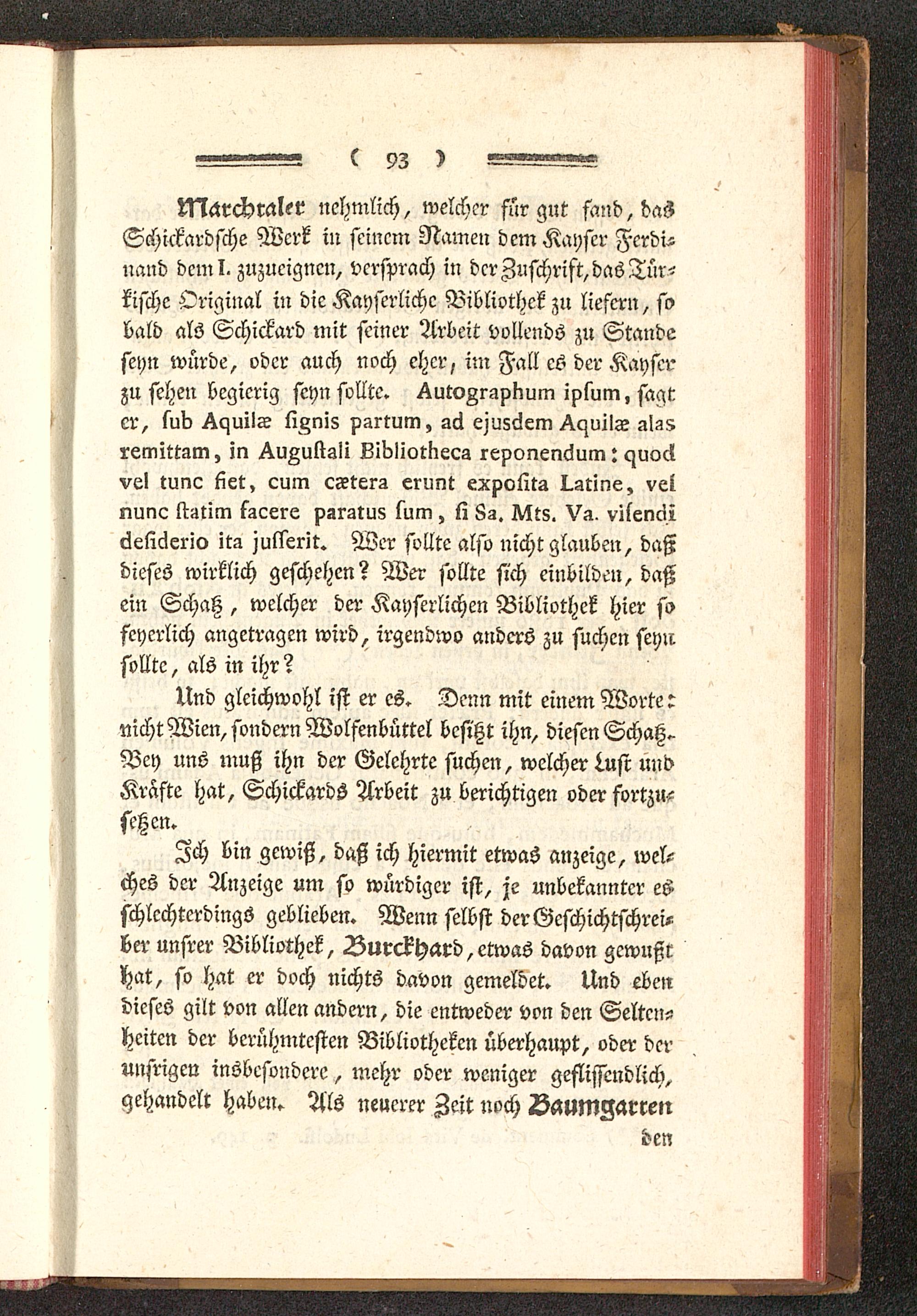 !Narchraler nehmlich, welcher für gut fand, dasSchickardsche Werk in seinem Namen dem Kayfer Ferdi-nand dcm l. zuzueignen, versprach in der Aischrift, das Tür-kische Original in die Kayserlichc Bibliothek zu liefern, sc»bald als Schickard mit seiner Arbeit vollends zu Standeseyn würde, oder auch noch eher, im Fall es der Kayscrzu sehen begierig seyn sollte. ^utoZrapnum iplum, sagter, lud HquilT liZnis psrtum, scl ejus6em H^mlseremittsm, in ^ugullsli LibliotKecs reponencZum: c^uockvel tunc 5et, cum cTters erunt expolita I.at!ne, ve!nunc liittim tscere psrstus lum , ii 8g. l^lt8. Va, vitenci!6elie1erio ita jullerit. Wer sollte also nicht glauben, daßdieses wirklich geschehen? Wer sollte sich einbilden, daßein Schaß , welcher der Kayserlichen Bibliothek hier sofcyerlich angetragen wird, irgendwo anders zu suchen seyilsollte, als in ihr?