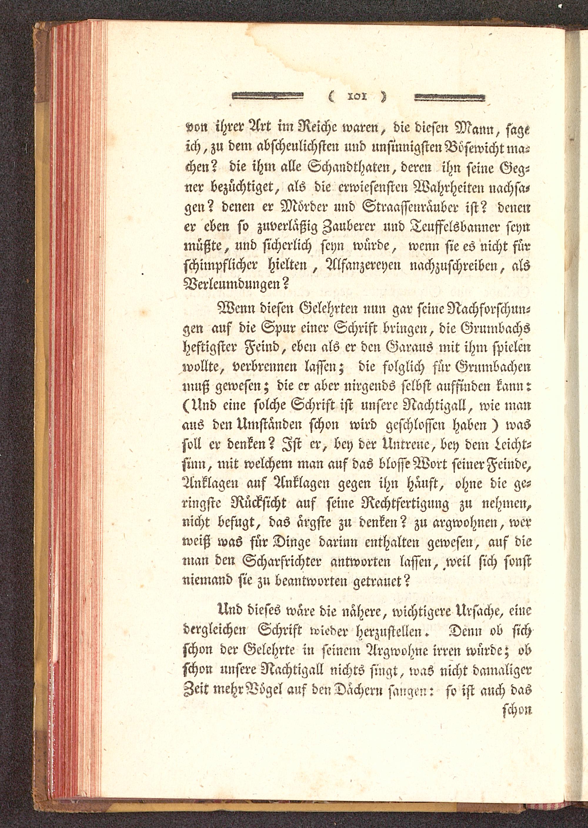 Wenn diesen Gelehrten nnn gar seine Nachforschun-gen auf die Spur einer Schrift bringen, die Grmnbachsheftigster Feind, eben als er den Garaus mit ihm spielenwollte, verbrennen lassen; die folglich für Grumbachenmuß gewesen; die er aber nirgends selbst auffinden kann:(Und eine solche Schrift ist unsere Nachtigall, wie manaus den Umstanden schon wird geschlossen haben ) waSsoll er denken? Ist er, bey der Untreue, bey dem Leicht-sinn, mit welchem man auf das blosse Wort seiner Feinde,Anklagen auf Anklagen gegen ihn haust, ohne die ge-ringste Rücksicht auf seine Rechtfertigung zu nehmen,nicht befugt, daS ärgste zu denken? zu argwohnen, werweiß was für Dinge darum enthalten gewesen, auf dieman den Scharfrichter antworten lassen, weil sich sonstniemand sie zu beantworten getrauet?