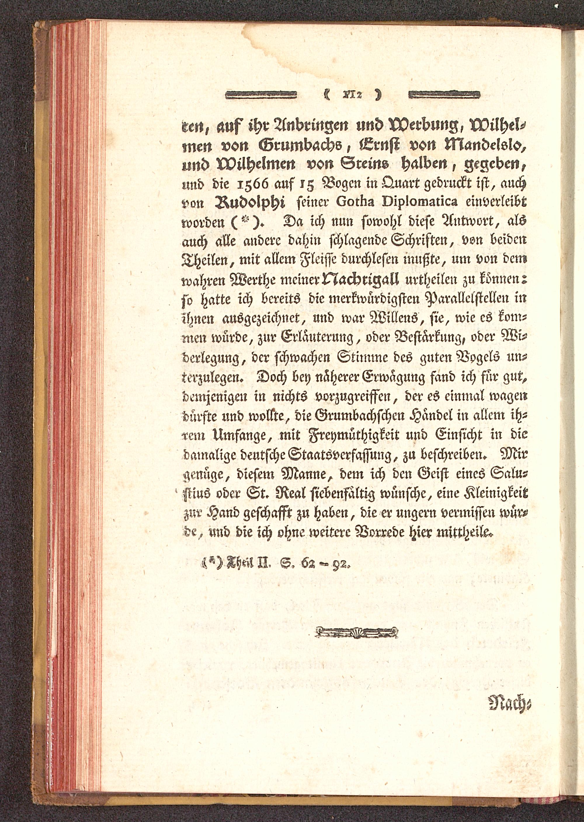 und die 1566 auf iZ Bogen in Quart gedruckt ist, auchvon Rudolphi seiner QotKa Diplomattes einverleibtworden ). Da ich nun sowohl diese Antwort, alsauch alle andere dahin schlagende Schriften, von beidenTheilen, mit allem Fleisse durchlesen mußte, um von demwahren Werthe meiner Nachtigall urtheilen zu können:so hatte ich bereits die merkwürdigsten Parallelstcllen inihnen ausgezeichnet, und war Willens, sie, wie es kom-men wurde, Zur Erläuterung, oder Bestärkung, oder Wi-derlegung, der schwachen Stimme des guten Vogels un-terzulegen. Doch bey näherer Erwägung fand ich für gut,demjenigen in nichts vorzugreiffen, der es einmal wagendürfte und wollte, die Grumbachschcn Handel in allem ih--rem Umfange, mit Freymüthigkeit und Einsicht in diedamalige deutsche Staatsverfassung, zu beschreiben» Mirgenüge, diesem Manne, dem ich den Geist eines Salu-' Mus oder St. Real siebenfältig wünsche, eine Kleinigkeitzur Hand geschafft zu haben, die er ungern vermissen wür-de, und die ich ohne weitere Vorrede hier mittheile»