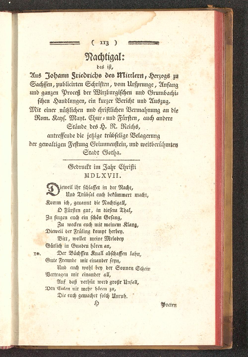 Und Trübsal cuch bekümmert macht,Komm ich, genannt die Nachtigall,