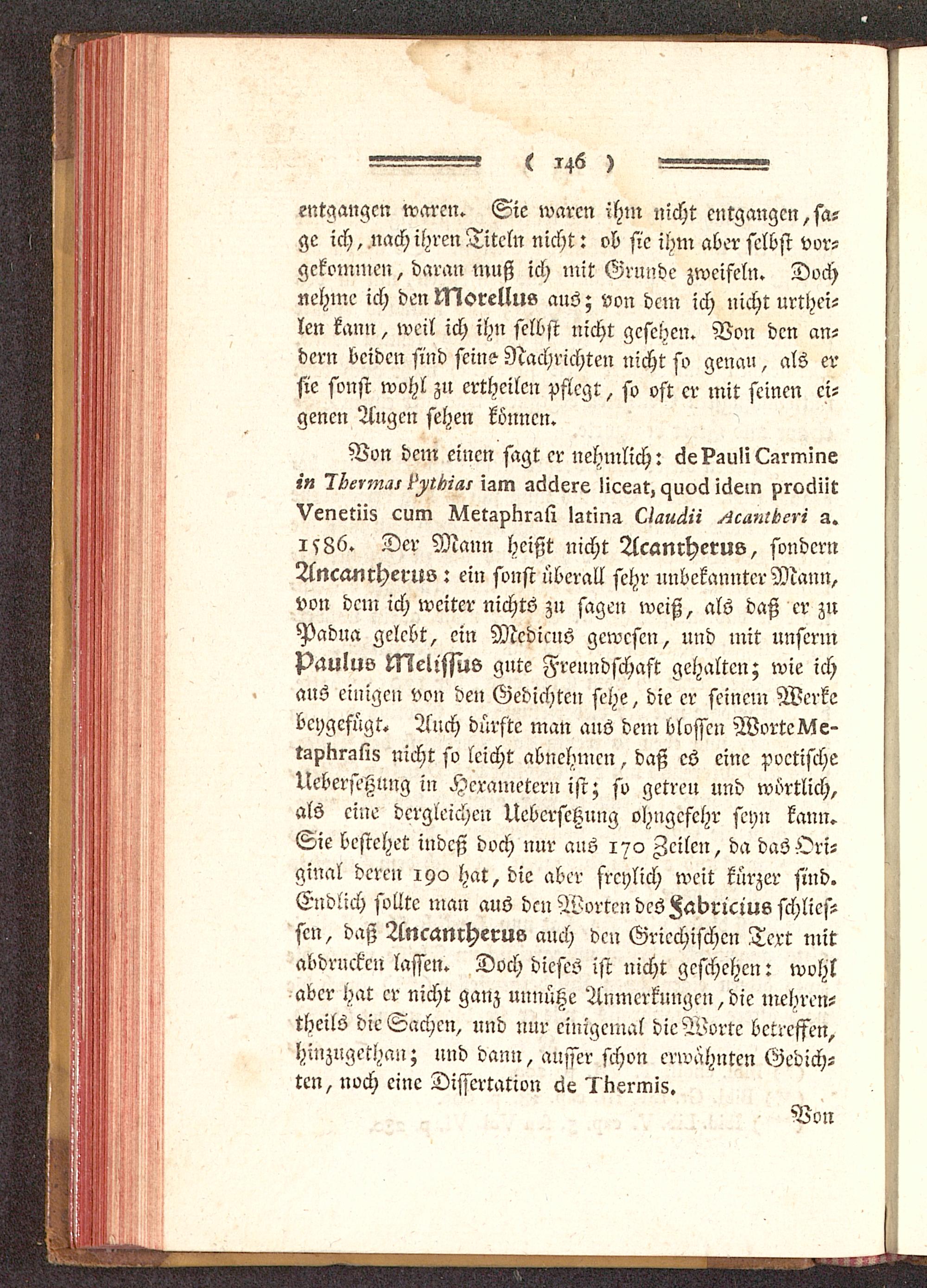 Venetüs cum ^letzpkrali Istina L/att^'i ^c<i->^i>e»'t a.isZö. Der Mann heißt nicht Acanrherus, sondernAnccmrherus : ein sonst überall sehr uubekanntcr Mann,von dem ich weiter nichts zu sage» weiß, als daß er zuPadua gelebt, ein Mcdicus gewesen, und mit unsermPaulus N?elissilS gute Freundschaft gehalten; wie ichaus einigen von den Gedichten sehe, die er seinem Werkebeygefügt« Auch dürfte man ans dem blossen Worte^e-tapkrglis nicht so leicht abnehmen, daß es eine poetischeUeberseZung in Hexametern ist; so getreu und wörtlich,als eine dergleichen Uebcrscßung ohngcfchr seyn kann.Sie bestehet indeß doch nur aus 170 Zeilen, da daS Ori-ginal deren 190 hat, die aber freylich weit kürzer sind.Endlich sollte man aus den Worten deö^abricius schlics-scn, daß Ancamheruv auch den Griechischen Tert mitabdrucken lassen. Doch dieses ist nicht geschehen: wohlaber hat er nicht ganz uunüße 'Anmerkungen, die mehren-thcils die Sachen, und nur einigemal die Worte betreffen,hinzugethan; und dann, ausser schon erwähnten Gedich-ten, noch eine Dissertation cie Ikermiz.