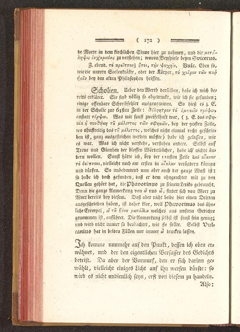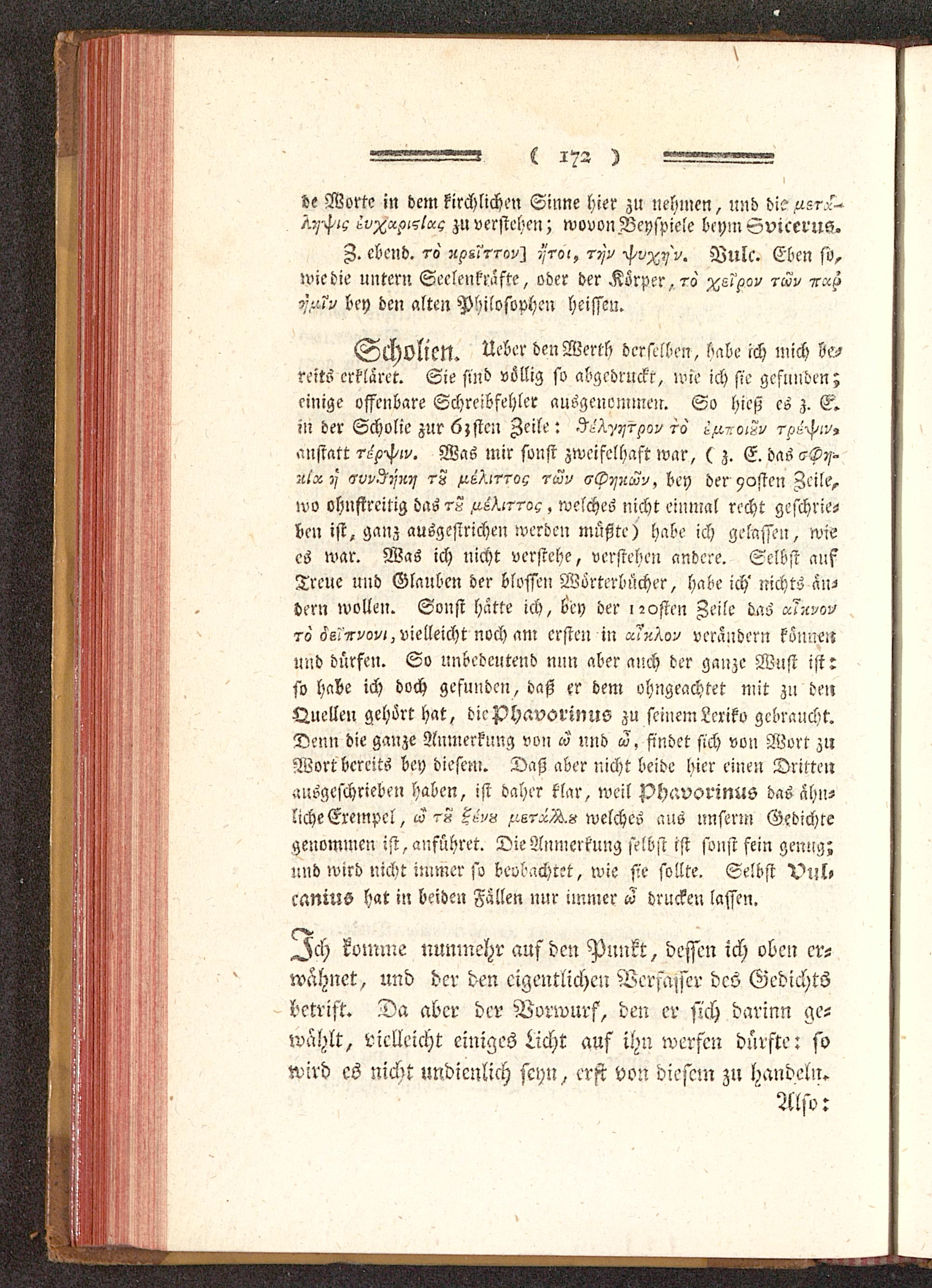 Schoücn. ^^er den Werth derselben , habe ich wich be,->reitv erkläret. Sie sind völlig so abgedrnckr, ivie ich sie gefunden;einige offenbare Schreibfehler ausgenommen. So hieß es z. E.in der Scholie zur 6zstcn Acile: I^z/^-z/ ?o ^?o-Ä i^---^,anstatt ?-//--^>l/. Was mir sonst zweifelhaft war, ( z. E. da» -7S^°:c/«,/ s'vi/Ä/zc^ ?s ^e/.i^os 7---)v <7V>/?cÄV, bey der yosten Ieile<wo ohnstrcitig das?>? ^s).<??oc > welches nicht einmal recht geschrie-ben ist, ganz ausgestrichen werden müßte) habe ich gelassen, wiees war. Was ich nicht verstehe, verstehen andere. Selbst ansTreue und Glauben der blossen Wörterbücher, habe ich' nichts an-dern wollen. Sonst hatte ich, bey der 1 mosten Zeile das «7:c^sv50 Fe-'wovi, vielleicht noch am ersten in c--'^o^ verändern könnestund dürfen. So unbedeutend nun aber anch der ganze Wust ist:so habe ich doch gefunden, daß er dem ohngeachtet mit zn de>»Quellen gehört hat, diePhavorinus zu seinem Leriko gebraucht.Denu die ganze Anmerkung von und -5, findet sich von Wort zuWort bereits bey diesen». Daß aber nicht beide hier einen Drittenausgeschrieben haben, ist daher klar, weil phavorinus das ähn-liche Erempcl, w 5« 5^« ^k^H.s welches aus unserm Gedichtegenommen ist, anführet. Die Anmerkung selbst ist sonst fein genug;und wird nicht immer so beobachtet, wie sie sollte. Selbst Vnl»canius hat in beiden Fallen nur immer drucken lassen.