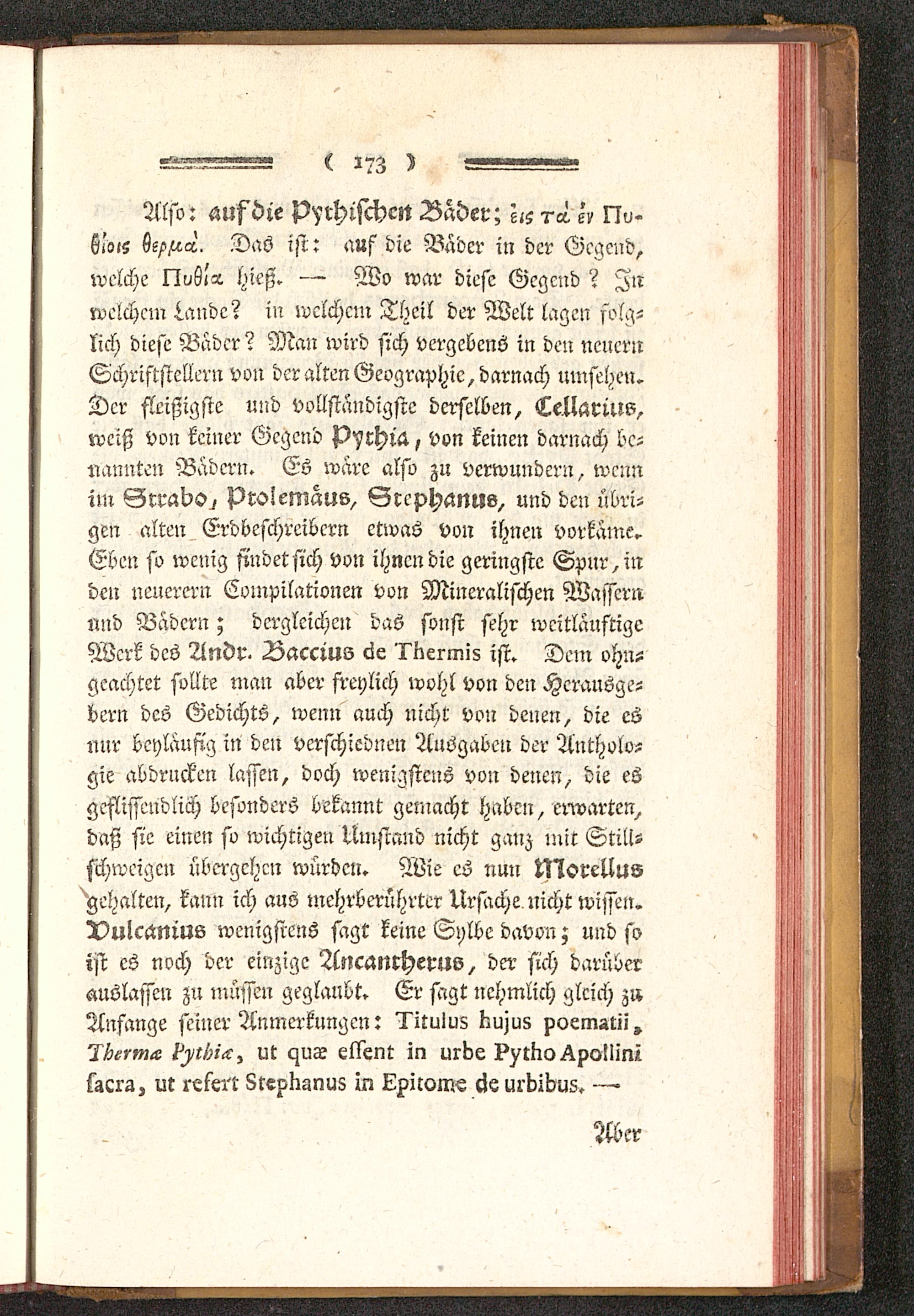 welche I?u6i» hieß. — Wo war diese Gegend? Inwelchem j.andc? in welchem Theil der Welt lagen folg-lich diese Bader? Man wird sich vergebens in den neuernSchriftstellern von der alten Geographie, darnach umsehen.Der fleißigste und vollständigste derselben, Cellarüw,weiß von keiner Gegend p^rhiü, von keinen darnach be-nannten Badern. Es wäre also zu verwundern, wennim Grrabc^ Prolemaus, Srephanus, und den übri-gen alten Erdbefchreibcrn etwas von ihnen vorkäme.Eben so wenig sindetsich von ihnen die geringste Spur,mden neuerem Compilationen von Mineralischen Wassernnud Bädern; dergleichen das sonst sehr weitlänstigeWerk des Andr. Baccius 6e l'nermis ist. Dem vhn-gcachtet sollte man aber freylich wohl von den Herausge-bern des Gedichts, wenn auch nicht von denen, die eSnur beyläufig in den vcrfchicdnen Ausgaben der Antholo-gie abdrucken lassen, doch wenigstens von denen, die esgeflissendlich besonders bekannt gemacht haben, erwarten,daß sie einen so wichtigen Umstand nicht ganz mit Still-schweigen übergehen würden. Wie es nun tNorellusgehalten, kann ich aus mehrberührter Ursache nicht wissen.Dulcsnms wenigstens sagt keine Sylbe davon; und soist es noch der einzige Attcamherus, der sich darüberanslassen zu müssen geglaubt. Er sagt nehmlich gleich zuAnfange seiner Anmerkungen: l'itulus Kujus poematii,?H-»-m-e H/l/^, ut HUT ellent in urbe?^tlic>^po!lmlfzcra, ur reterr 8rex>Kgnu8 In Lxitom? urbibu5. —