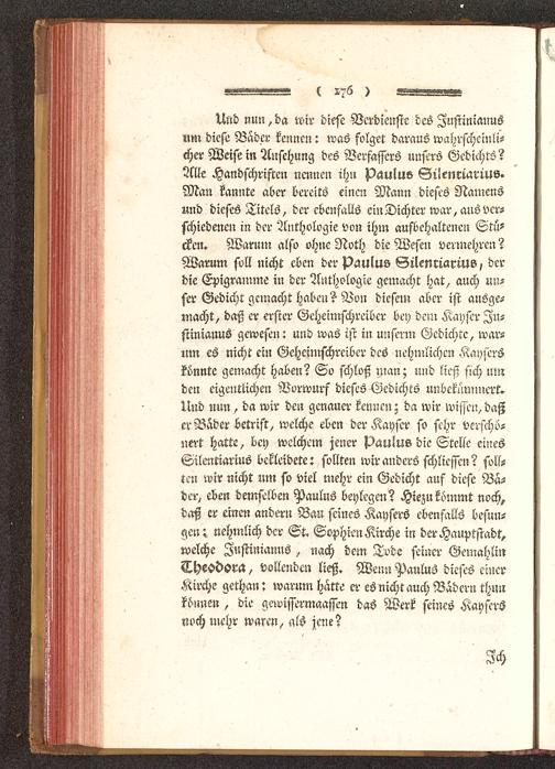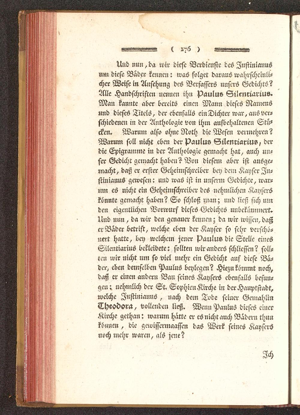 Und nun, da wir diese Verdienste des Zustinianusunr diese Bäder kennen: was folget daraus wahrscheinli-cher Weise in Ansehung des Verfassers unsers Gedichts?Alle Handschristen nennen ihn Paulus Silenriarius.Man kannte aber bereits einen Mann dieses Namensund dieses Titels, der ebenfalls ein Dichter war, aus ver-schiedenen in der Anthologie von ihm aufbehaltenen Stü-cken. Warum also ohne Noth die Wesen vermehren?Warum soll nicht eben der Paulus Silenriarius, derdie Epigramme in der Anthologie gemacht hat, auch un-ser Gedicht gemacht haben? Von diesem aber ist ausge-macht, daß er erster Geheimschreiber bey dein Kayser Zu-stinianus gewesen: und was ist in unserm Gedichte, war-um es nicht ein Gchcimschreiber des nehmlichen Kayserskönnte gemacht haben? So schloß man; und ließ sich umden eigentlichen Vorwurf dieses Gedichts unbekümmert.Und nun, da wir den genauer kennen; da wir wissen, daßer Bader betrist, welche eben der Kayser so sehr verschö-nert hatte, bey welchem jener Paulus die Stelle einesSilentiarius bekleidete: sollten wir anders schließen? soll-ten wir nicht um so viel mehr ein Gedicht auf diese Ba-der, eben demselben Paulus beylegen? Hiezu kömmt noch,daß er einen andern Bau seines Kaysers ebenfalls besun-gen: nehmlich der St, Sophien Kirche in der Hauptstadt,welche Zustinianus, nach dem Tode seiner GemahlinTheodors, vollenden ließ. Wenn Paulus dieses einerKirche gethan: warumhatte er es nicht auch Bädern thunkönnen, die gewissermaassen das Werk seines KapftrSnoch mehr waren, als jene?