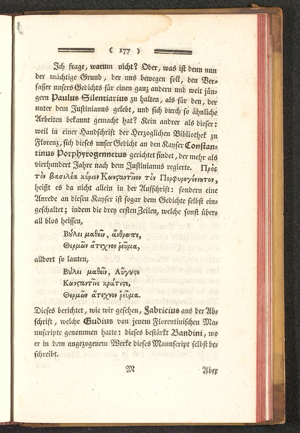 Ich frage, warum nicht? Oder, was ist denn nunder mächtige Grund, der uns bewegen soll, den Ver-fasser unsers Gedichts für einen ganz andern und weit jun-gem Paulus Gilemiarius zu halten, als für den, derunter dein Iustinianus gelebt, und sich durch so ahnlicheArbeiten bekannt gemacht hat? Kein andrer als dieser:weil in einer Handschrist der Herzoglichen Bibliothek znFlorenz, sich dieses unser Gedicht an denKayserConsian-rinus Porphyrsgennerus gerichtet findet, der mehr alsvierhundert Jahre nach dem Iustinianus regierte, shos7-L» ßai?/?^» xu/-to» Xwi'5A»'N>'!!i' T'c,' I?o/>P^s^e^«'r'o»,heißt es da nicht allein in der Aufschrist: sondern eineAnrede an diesen Kayser ist sogar dem Gedichte selbst ein-geschaltet; indem die drey crstenAeilen, welche sonst übersall blos heissen,
