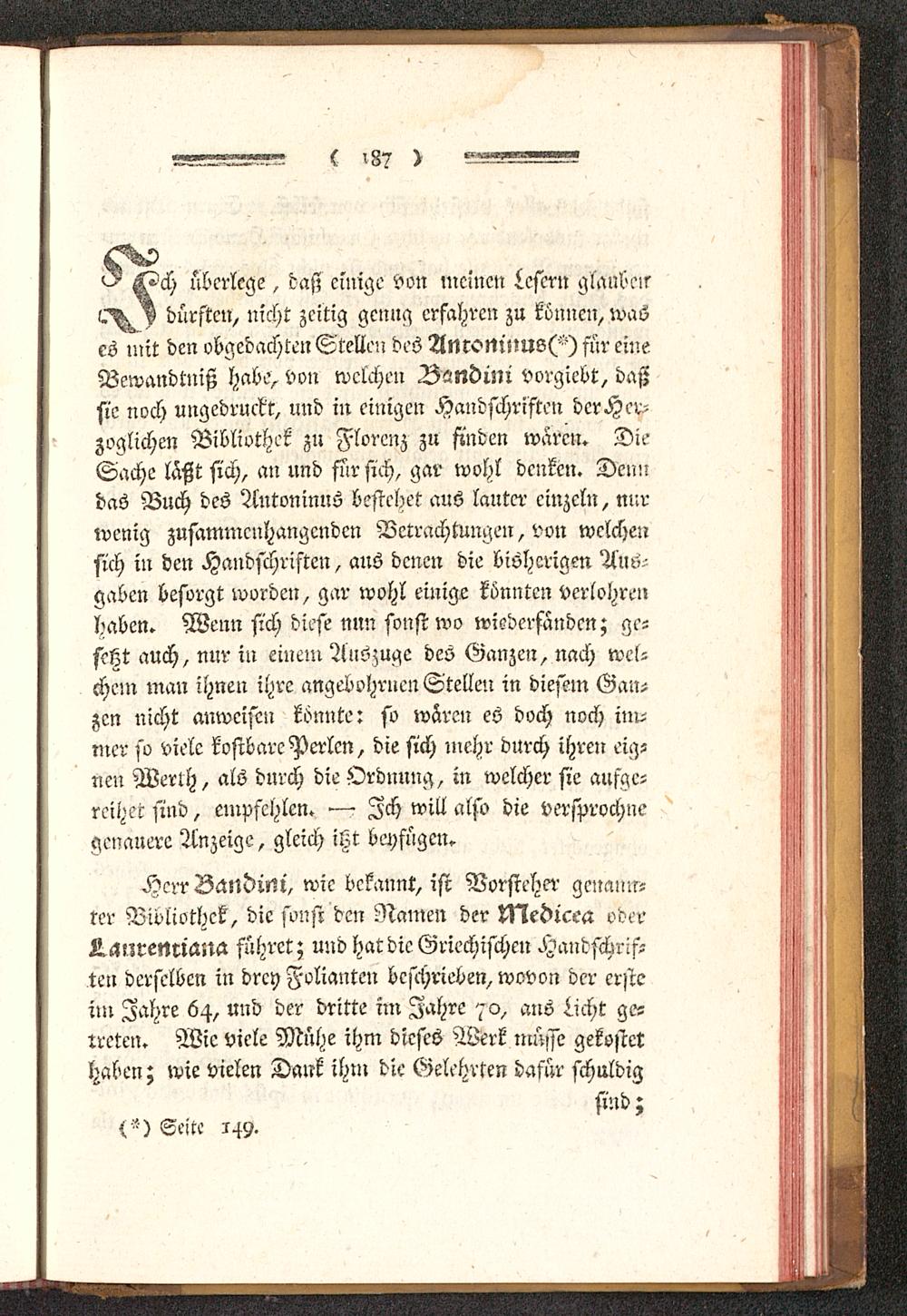^ ^>ch überlege, daß einige von meinen Lesern glauben-D dürsten, nicht zeitig genug erfahren zu können, wases mit den obgedachten Stellen des Anrc>NlttUS(') für eineBewandtniß habe, von welchen Vsndüii vorgiebt, daßsie noch ungedruebt, und in einigen Handschristen derHer-zoglichen Bibliothek zu Florenz zu finden waren. DieSache läßt sich, an und für sich, gar wohl denken. Denndas Buch des Antoninus bestehet aus lauter einzeln, nurwenig zusammenhangenden Betrachtungen, von welchensich in den Handschriften, aus denen die bisherigen Am--gaben besorgt worden, gar wohl einige könnten verlohrenhaben. Wenn sich diese nun sonst wo wiederfanden; ge-setzt auch, nur in einem Auszüge des Ganzen, nach wel-chem man ihnen ihre angebohrnen Stellen in diesem Gan-zen nicht anweisen könnte: so wären eS doch noch iin-mcr so viele kostbare Perlen, die sich mehr durch ihren eig-nen Werth, als durch die Ordnung, in welcher sie aufge-reihet sind, empfehlen. — Ich will also die versprochn«,'genauere Anzeige, gleich itzt beyfügen.