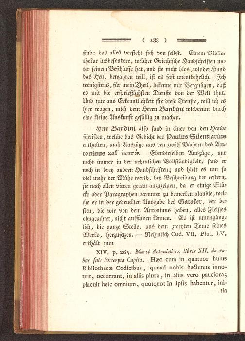 Herr Bandini also fand in einer von den Hand-schriften, welche das Gedicht des Paulus Silentiarius enthalten, auch Auszüge aus den zwölf Büchern des An-roninus x«,6' e«^^. Ebendieselben Auszüge, nurnicht immer in der nehmlichen Vollständigkeit, fand ernoch in drey andern Handschriften; und hielt es um soviel mehr der Mühe werth, bey Beschreibung der erstem,sie nach allen vieren gcnan anzuzeigen, da er einige Stü-cke oder Paragraphen darunter zu bemerken glaubte, wel-che er in der gedruckten Ausgabe des Garaker, der be-sten, die wir von dem Antoninus haben, alles Fleissesohngeachtet, nicht auffinden können. Es ist unumgäng-lich, die ganze Stelle, auS dem zweyten Tome seinesWerks, herzusetzen. — Nehmlich Loci. VII. ?Im. I.V.enthält zum