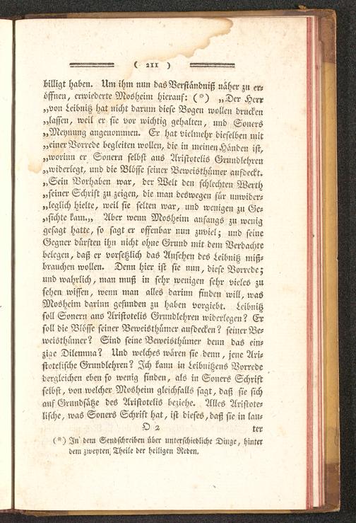 billigt haben. Um ihm nun das Verständniß näher zu er-öffnen, erwiederte Mosheim hierauf: „Der Herr„von ^eibniß hat nicht darum diese Bogen wollen drucken„lassen, weil er sie vor wichtig gehalten, und Soners„Meynung angenommen. Er hat vielmehr dieselben mit„cinerVorrede begleiten wollen, die in meinen Handen ist,„worinn er Soncrn selbst aus Aristotcliö Grundlehren„widerlegt, und die Blosse seiner Beweisthümer aufdeckt.„Sein Vorhaben war, der Welt den schlechten Werth„seiner Schrift zu zeigen, die man deswegen für uuwider-„lcglich hielte, weil sie selten war, und wenigen zu Ge-richte kam.,, Aber wenn Mosheim anfangs zu weniggesagt hatte, so sagt er offenbar nun zuviel; und seineGegner dürsten ihn nicht ohne Grund mit dem Verdachtebelegen, daß er vorfeßlich das Ansehen des teibniß miß-brauchen wollen. Denn hier ist sie nun, diese Vorrede;und wahrlich, man muß in sehr wenigen sehr vieles zusehen wissen, wenn man alles darum finden will, wasMosheim darum gefunden zu haben vorgiebt, ^cibnißsoll Sonern aus Aristotcliö Grundlehren widerlegen? Ersoll die Blosse feiner Veweisthümcr aufdecken? seiner Be-weisthümer? Sind seine Beweisthümer denn das ein-zige Dilemma? Und welches waren sie deun, jene Ari-stotelische Grnndlehren? Ich kann in ^eibnißens Vorrededergleichen ebenso wenig finden, als in Soners Schriftselbst, von welcher Mosheim gleichfalls sagt, daß sie sichauf Grundsatze des Aristotcliö beziehe. Alles Aristote-lische, was Soners Schrift hat, ist dieses, daß sie in lau-