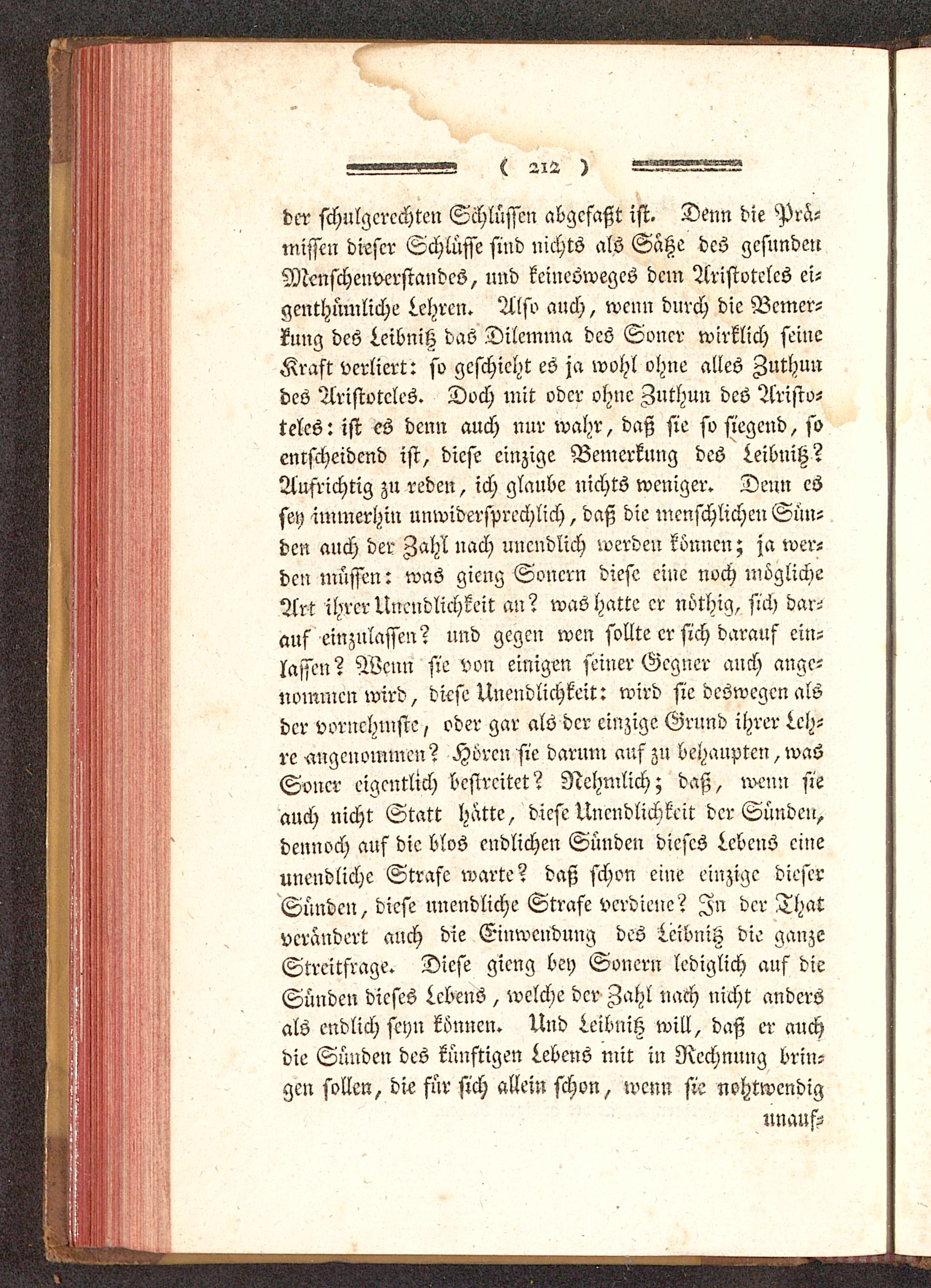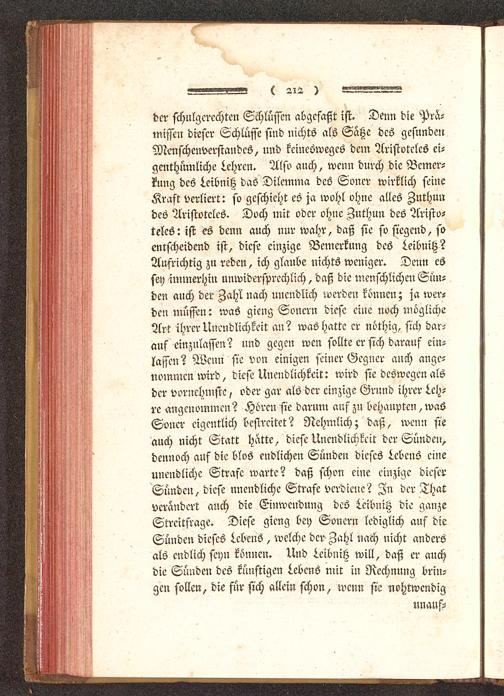 der schulgercchten Schlüssen abgefaßt ist. Denn die Prä-missen dieser Schlüsse sind nichts als Säße des gesundenMenschenverstandes, und keineswegcs dein Aristoteles ei-genthümliche kehren. Also auch, wenn durch die Bemer-kung des Leibniß das Dilemma des Soncr wirklich seineKraft verliert: so geschieht es ja wohl ohne alles Zuthundes Aristoteles . Doch mit oder ohne Zuthun des Aristo-teles : ist es denn auch nur wahr, daß sie so siegend, soentscheidend ist, diese einzige Bemerkung des Leibnitz ?Aufrichtig zu reden, ich glanbe nichts weniger. Denn eSsey immerhin unwidersprechlich, daß die menschlichen Sün-den auch der Zahl nach unendlich werden können; ja wer-den müssen: was gicng Sonern diese eine noch möglicheArt ihrer Unendlichkeit an? was hatte er nöthig, sich dar-auf einzulassen? und gegen wen sollte er sich darauf ein-lassen? Wenn sie von einigen seiner Gegner auch ange-nommen wird, diese Unendlichkeit: wird sie deswegen alsder vornehmste, oder gar als der einzige Grund ihrer ^eh-re -angenommen? Hören sie darum auf zu behaupten, wasSoncr eigentlich bcstrcitet? Nehmlich; daß, wenn sieauch uicht Statt hatte, diese Unendlichkeit der Sünden,dennoch auf die blos endlichen Sünden dieses Gebens eineunendliche Strafe warte? daß schon eine einzige dieserSünden, diese unendliche Strafe verdiene? In der Thatverändert auch die Einwendung des Leibnitz die ganzeStreitfrage. Diese gicng bey Sonern lediglich auf dieSünden dicfes Lebens, welche der Zahl nach nicht andersals endlich seyn können. Und Leibniß will, daß er auchdie Sünden des künftigen Lebens mit in Rechnung brin-gen sollen, die für sich allein schon, wenn sie notwendig