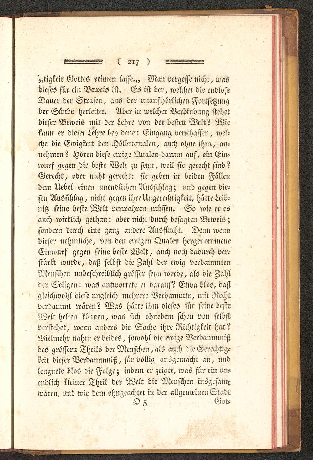 „tigkeit Gottt6 reimen lasse.,. Man vergesse, nicht, wasdieses für ein Beweis ist. Es ist der, welcher die endlosDauer der Strafen, aus der unaufhörlichen Fortsetzungder Sünde herleitet. Aber in welcher Verbindung stehetdieser Beweis mit der lehre von der besten Welt? Wiekann er dieser lehre bey denen Eingang verschaffen, wel-che die Ewigkeit der Höllenqualen, auch ohne ihm, an-nehmen? Hören diese ewige Qualen darum auf, ein Ein-wurf gegen die beste Welt zu seyn, weil sie gerecht sind?Gerecht, oder nicht gerecht: sie geben in beiden Fällendem Uebel einen unendlichen Ausschlag; und gegen die-stn Ausschlag, nicht gegen ihre Ungerechtigkeit, hätte leib-uiß seine beste Welt verwahren müssen. So wie er esauch wirklich gethan: aber nicht durch besagten Beweis;sondern durch eine ganz andere Ausflucht. Denn wenndieser nehmliche, von den ewigen Qualen hergenommeneEimvurf gegen seine beste Welt, auch noch dadurch ver-stärkt wurde, daß selbst die Zahl der ewig verdammtenMenschen unbeschreiblich grösser seyn werde, als die Zahlder Seligen: was antwortete er darauf? Etwa blos, daßgleichwohl diese ungleich mehrere. Verdammte, mit Rechtverdammt wären? Was hätte ihm dieses für seine besteWelt helfen können, was sich ohnedem schon von selbstverstehet, wenn anders die Sache ihre Richtigkeit hat?Vielmehr nahm er beides, sowohl die ewige Verdammnisides grössern Theils der Menschen, als auch die Gerechtig-keit dieser Verdammniß, für völlig ausgemacht an, nndleugnete blos die Folge; indem er zeigte, was für ein un-endlich kleiner Theil der Welt die Menschen insgesamtwären, und wie dein ohngeacktet in der allgemeinen Stadt