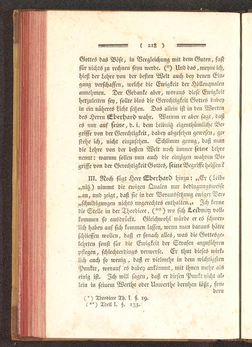 III. Noch fügt Herr Eberhard hinzu: „Er (Leib-„nitz) nimmt die ewigen Qualen nur bedingungsweise„an, und zeigt, daß sie in der Voraussetzung ewiger Ver-„schuldigungen nichts ungerechtes enthalten.,, Ich kennedie Stelle in der Theodicce, wo sich L.eibmy voll-kommen so ausdrückt. Gleichwohl würde er cS schwer-lich haben auf sich kommen lassen, wenn man daraus hatteschliesset: wollen, daß er sonach alles, was die Gottesge-lehrten sonst für die Ewigkeit der Strafen anzuführen^siegen, schlechterdings verwerfe. Er thut dieses wirk-lich auch so wenig, daß er vielmehr in dem wichtigstenPunkte, worauf >s dabey ankömmt, mit ihnen mehr alseinig ist. Ich will sagen, daß er diesen Punkt nicht al-lein in seinem Werthe oder Unwerthe beruhen laßt, son-dern