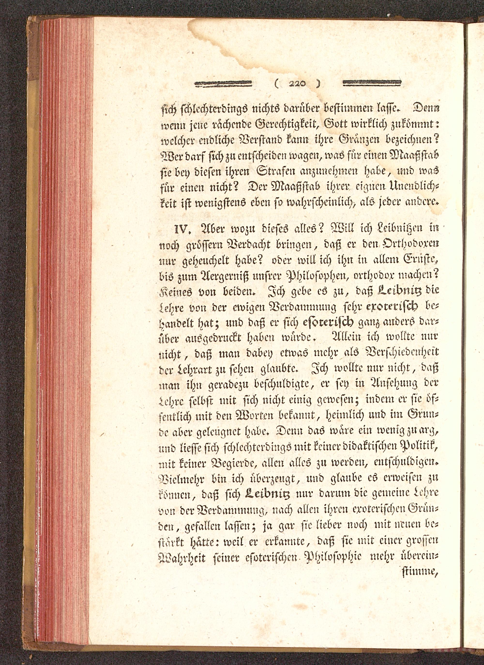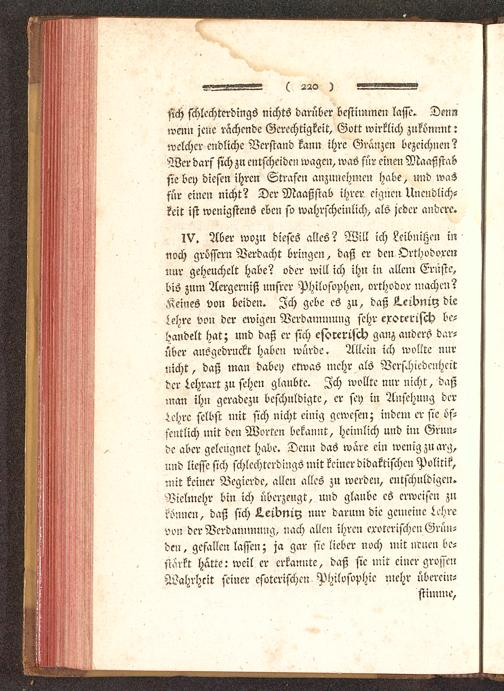 IV. Aber wozu dieses altes? Will ich Leibnißen innoch grössern Verdacht bringen, daß er den Orthodoxennur geheuchelt habe? oder will ich ihn in allem Erliste,bis zum Aergerniß unsrer Philofophen, orthodor machen?Keines von beiden. Ich gebe es zu, daß i!.eibniy dielehre von der ewigen Verdammung sehr exorerisch be-handelt hat; und daß er sich esoterisch ganz anders dar-über ausgedruckt haben würde. Allein ich wollte mirnicht, daß man dabey etwas mehr als Verschiedenheitder Lehrart zu sehen glaubte. Ich wollte nur nicht, daßman ihn geradezu beschuldigte, er sey in Ansehung deriehrc selbst mit sich nicht einig gewesen; indem erste öf-fentlich mit den Worten bekannt, heimlich und im Grun-de aber geleugnet habe. Denn das wäre ein wenig zu arg,und liesse sich schlechterdings mit keiner didaktischen Politik,mit keiner Begierde, allen alles zu werden, entschuldigen.Vielmehr bin ich überzeugt, und glaube es erweisen zukönnen, daß sich L.eibniy nur darum die gemeine Lehrevon der Verdammung, nach allen ihren eroterischen Grün-den, gefallen lassen; ja gar sie lieber noch mit neuen be-stärkt hatte: weil er erkannte, daß sie mit einer grossenWahrheit seiner esoterischen Philosophie mehr überein-stimme,