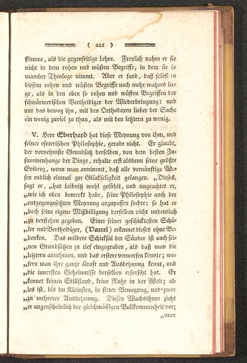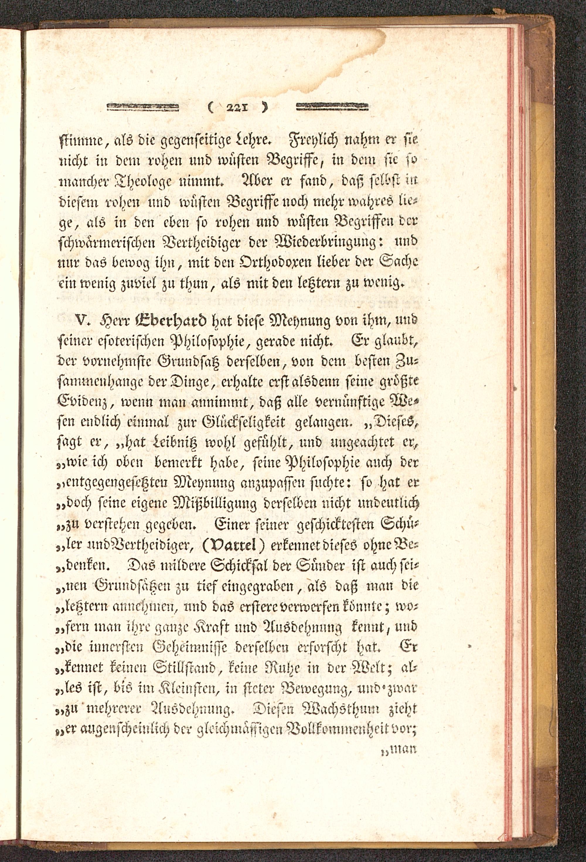 V. Hei-r Eberhard hat diese Meynung von ihm, undseiner esoterischen Philosophie, gerade nicht. Er glaubt,der vornehmste Grundsatz derselben, von dem besten Zu-sammenhange der Dinge, erhalte crst alsdenn seine größreEvidenz, wenn man annimmt, daß alle vernünftige We»sen endlich einmal zur Glückseligkeit gelangen. „Dieses,sagt er, ,,hat lcibniß wohl gefühlt, und ungeachtet er,„wie ich oben bemerkt habe, seine Philosophie auch der„entgegengesetzten Meynung anzupassen suchte: so hat er„doch seine eigene Mißbilligung derselben nicht undeutlich„zu verstehen gegeben. Einer seiner- geschicktesten Schü-ler undVcrtheidiger, (Varrel) erkennet dieses ohne Be-denken. Das mildere Schicksal der Sünder ist auch sel-tnen Grundsätzen zu tief eingegraben, als daß man die„letztem annehmen, nnd das erstere verwerfen könnte; wo?„fern man ihre ganze Kraft nnd Ausdehnung kennt, und„die innersten Geheimnisse derselben erforscht hat. Er„kennet keinen Stillstand, keine Ruhe in der Welt; ab„les ist, bis ini Kleinsten, in steter Bewegung, und'zwar„zu mehrerer Ausdehnung. Diesen Wachsthum zieht„er augenscheinlich der gleichmässigen Vollkommenheit vor;