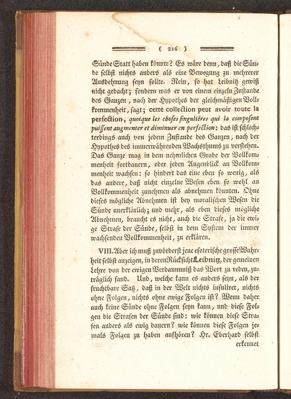 VIII.Aber ich muß zuvörderst jene esoterische grosseWahr-hcit selbst anzeigen, in dcrenRückflchtL.eibniy, der gemeinen5ehre von der ewigen Berdammniß das Wort zu reden, zu-träglich fand. Und, welche kann es anders seyn, als derfruchtbare Satz, daß in der Welt nichts insuliret, nichtsohne Folgen, nichts ohne ewige Folgen ist? Wenn daherauch keine Sünde ohne Folgen seyn kann, und diese Fol-gen die Strafen der Sünde sind: wie können diese Stra-fen anders als ewig dauern? wie können diese Folgen je-mals Folgen zu haben aufhören? Hr. Eberhard selbst