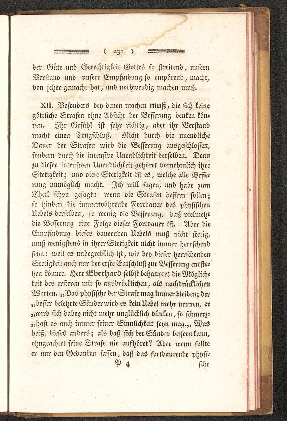 Xll. Besonders bey denen machen muß, die sich keinegöttliche Strafen ohne 'Absicht der Besserung denken kön-nen. Ihr Gefühl ist sehr richtig, aber ihr Verstandmacht einen Trugschluß. Nicht durch die unendlicheDancr der Strafen wird die Besserung ausgeschlossen,sondern durch die intensive Unendlichkeit derselben. Dennzu dieser intensiven Unendlichkeit geHörer vornehmlich ihreStetigkeit; und diese Stetigkeit ist es, welche alle Besse-rung unmöglich macht. Ich will sagen, und habe zumTheil schon gesagt: wenn die Strafen bessern sollen;so hindert die immerwährende Fortdauer des physischenUebels derselben, so wenig die Besserung, daß vielmehrdie Besserung eine Folge dieser Fortdauer ist. Aber dieEmpfindung dieses dauernden Uebels muß nicht stetig,muß wenigstens in ihrer Stetigkeit nicht immer herrschendseyn: weil es unbegreiflich ist, wie bey dieser herrschendenStetigkeit auch nur der erste Entschluß zur Besserung entste-hen könnte. Herr Eberhard selbst behauptet die Möglich-keit des ersteren mit so ausdrücklichen, als nachdrücklichenWorten. „Das physische der Strafe mag immer bleiben; der„besser belehrte Sünder wird es kein Uebel mehr nennen, er„wird sich dabey nicht mehr unglücklich dünken, so schmerz-„haft es auch immer seiner Sinnlichkeit seyn mag.,, Washeißt dieses anders; als daß sich der Sünder bessern kann,ohngeachtet seine Strafe nie aufhöret? Aber wenn sollteer nur den Gedanken fassen, daß das fvrtdaurende physi-
