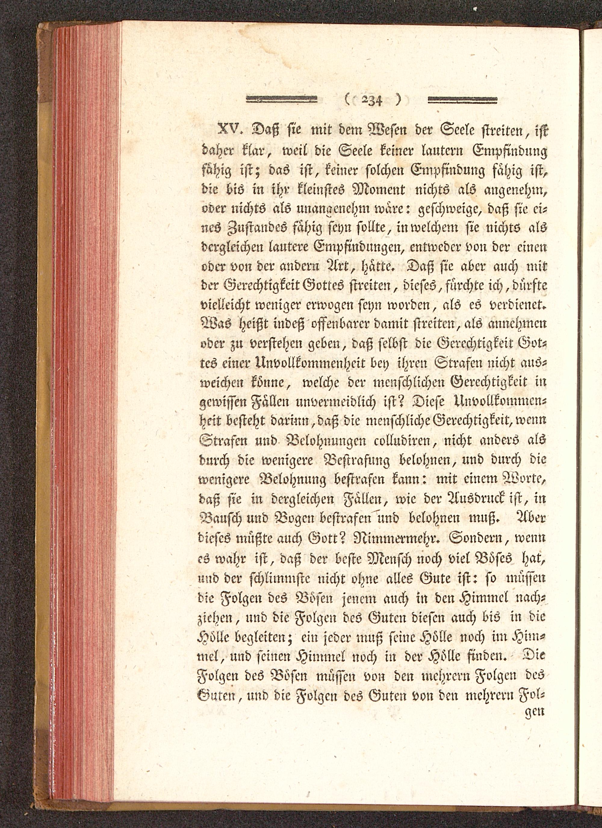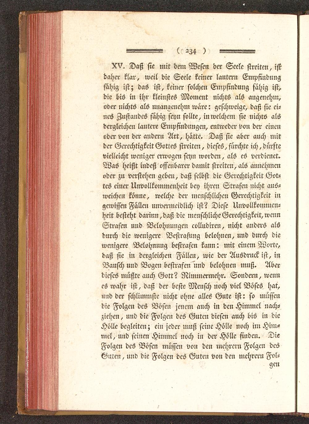 XV. Daß sie mit dem Wesen der Seele streiten, istdaher klar, weil die Seele keiner läutern Empfindungfähig ist; das ist, keiner solchen Empfindung fähig ist,die bis in ihr kleinstes Moment nichts als angenehm,oder nichts als unangenehm wäre: geschweige, daß sie ei-nes Ausrandes fähig seyn sollte, in welchem sie nichts alsdergleichen lautere Empfindungen, entweder von der einenoder von der andern Art, hätte. Daß sie aber auch mitder Gerechtigkeit Gottes streiten, dieses, fürchte ich, dürftevielleicht weniger erwogen seyn worden, als es verdienet.Was heißt indeß offenbarer damit streiten, als annehmenoder zu verstehen geben, daß selbst die Gerechtigkeit Got-tes einer Unvollkvmmenhcit bey ihren Strafen nicht aus-weichen könne, welche der menschlichen Gerechtigkeit ingewissen Fällen unvermeidlich ist? Diese Unvollkommcn-heit besteht darinn,daß die menschliche Gerechtigkeit, wennStrafen und Belohnungen eolludiren, nicht anders alsdurch die wenigere Bestrafung belohnen, und durch diewenigere Belohnung bestrafen kann: mit einem Worte,daß sie in dergleichen Fällen, wie der Ausdruck ist, inBausch und Bogen bestrafen und belohnen muß. Aberdieses müßte auch Gott? Nimmermehr. Sondern, wennes wahr ist, daß der beste Mensch noch viel Böses hat,und der schlimmste nicht ohne alles Gute ist: so müssendie Folgen des Bösen jenem auch in den Himmel nach-ziehen , und die Folgen des Guten diesen auch bis in dieHölle begleiten; ein jeder muß seine Hölle noch im Him-mel, nnd seinen Himmel noch in der Hölle finden. DieFolgen des Bösen müssen von den mchrcrn Folgen des
