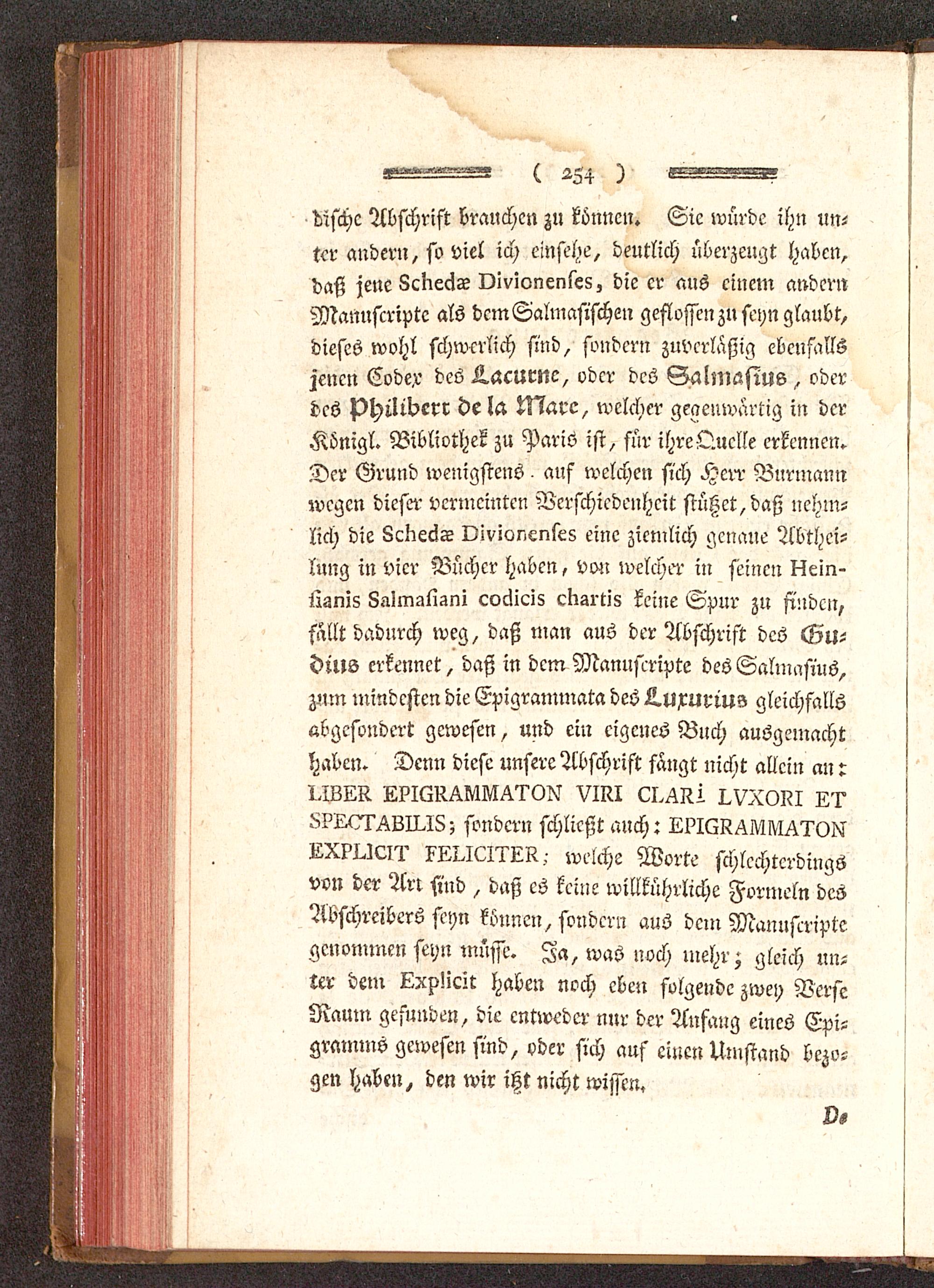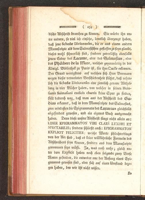 difchc Abschrift brauchen zu können. Sie würde ihn un-ter andern, so Viel ich einsehe, deutlich überzeugt haben,daß jene LcriedT vivionenles, die er aus einem andernMannftripte als dcmSalmasischen geflossen zn seyn glaubt,dieses wohl schwerlich sind, sondern zuverläßig ebenfallsjenen Codex des Aacurnc, oder des Salmasius , oderdes philibcrr de la Marc, welcher gegenwärtig in derKönigl. Bibliothek zu Paris ist, für ihre Quelle erkennen.Der Grund wenigstens auf welchen sich Herr Burmannwegen dieser vermeinten Verschiedenheit stützet, daß nehm-lich die LcKeäT Divionenleg eine ziemlich genaue Abthei-lung in vier Bücher haben, von welcher- in seinen ttein-jlimis 8-iImüliZni cocücis cksrtis keine Spur zu finden,fällt dadurch weg, daß man aus der Abschrift des Gu-dius erkennet, daß in dem Mannftripte des Salumsius,zmn mindesten die Epigrammata des L.uxuriu-?> gleichfallsabgesondert gewesen , und ein eigenes Buch ausgemachthaben. Denn diese unsere Abschrift fangt nicht allein an :LPIM^M^ON VIKI ci^Iii I.VX0I?! L'r^?!X7r^LII.18; sondern schließt auch:LX?Ucii' xxuciixk- welche Worte schlechterdingsvon der Ar: sind , daß es keine willkührliche Formeln desAbschreibers seyn können, sondern aus dein Manuftriptegenommen seyn müsse. Ja, was noch mehr; gleich un-ter dem Lxpücit haben noch eben folgende zwey VerseRaum gefunden, die entweder nur der Anfang eines Epi-gramms gewesen sind, oder sich auf einen Umstand bezo-gen haben, den wir itzt nicht wissen.
