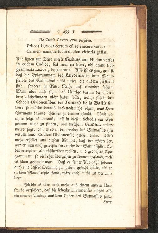 lind ihnen znr Seite merkt GudiUS an: Hi cluo ver5u?in ec>6em Lociice, ieä non eo loco, ubi ersntZrzmmzrg I^uxori, leZebancur. Also ist es ganz gewiß,daß die Epigrammata des L.uxorms in dem Manu,scripte des Salmasius nicht unter die andern zerstreutsind, sondern in Einer Reihe auf einander folgen.Wenn aber auch schon das Ucbrige darin» die anderndrey 'Abtheilungen nicht haben sollte, welche sich in den8cKec!i!Z IDivionenlibug des Bimard de la Vastie fin-den: so wurde daraus doch noch nicht folgen, was HerrVurmann daraus schliessen zu können glaubt. Noch we-niger folgt es daraus, daß in diesen 8cnecks ein Epi-gramm nicht zu finden, von welchem Gudms auder-werts sagt, daß er es in dem Evder des Salmasius (invetuü!tlimc> Loäice vivionenü) gelesen habe. Viel-mehr erhellet aus diesem Mangel, daß der Schreiber,wer er nun auch gewesen sey, mehr den Salmasischcn Co-dex e.rcerpiren als abschreiben wollen, und gedachtes Epi-gramm um so Viel eher übergehen zu können geglaubt, weiles schon gedruckt war. Daß er seiner Auswahl sodannauch eine bessere Ordnung zu geben gesucht hatte, als erin dein Manuskripte fand, wäre wohl nicht zu verwun-dern.