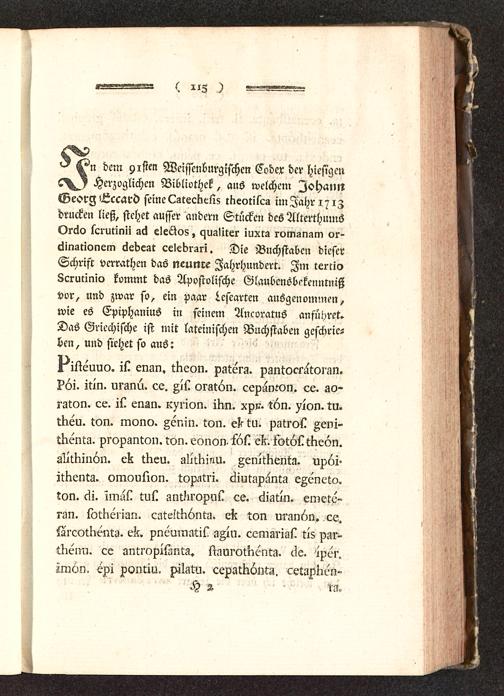 tt dem 9isien Weisscnburgischen Codex der hiesigen«7^5 Herzoglichen Bibliothek, auö welchem JohannGeorg'Lccard seine LatecKeliz tkeotiscs imJahri7izdrucken ließ, stehet ausser andern Stücken des AlterthumsOrcio lcrutinü sä eleQog, czuzliter iuxrs roman-,m or-ljinatlonem 6edcat celebrari. Die Buchstaben dieserSchrift verrathen das ncunre Jahrhundert. Im tertio8crutinicz kommt das Apostolische Glaubenöbi-kenntnißvor, und zwar so, ein paar lescarten ausgenommen,wie es EpiphaniuS in seinem Ancoratus anfüyret.Das Griechische ist mit lateinischen Buchstaben geschrie-ben , und siehet so ans: