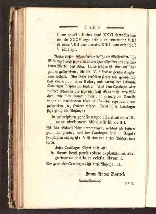 Ausser diesem Manuftripte besitzt dieWolfenbüttelscheBiblioryek noch sehr viele andere Handschriften von verschie-denen Werken des Beda. Unter solchen ist eine auf Per-gamcn geschriebene, die Hb. V. KiKorize Zentis ^nZlo-rum enthält. Ain Ende derselben stehet wie gewöhnlichdas curriculum vitae Leöse, und darauf der bekannteOtzIvAU8 scriptorum Lecise. Ans dem LzlaloZo aberunseres Manuseripts sehe ich, daß Beda nicht drey Bü-cher, wie man bisher glaubt, in principium Qencli5v>.que ac! n»r>uirstem l5»ac er limaelis rer>rc>bztlonelngeschrieben hat, sondern viere. Denn unser (>srizIoZuesa>it gleich im Anfange: