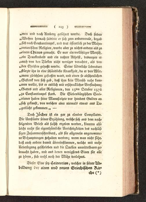 Doch Iöchcr ist ein gar zu elender Compilator.Die Umstände seiner Erzählung, welche sich aus dem nach-folgenden Briefe als falsch ergeben werden, könnten als»leicht mehr für eigenthümliche Unrichtigkeiten des nachläs-sigen Zusammenschreibet, als für allgemein angenomme-ne Behauptungen gehalten werden; wenn man nicht sahe,daß auch andere damit übereinstimmen, welche mit mehrUcberlcgung geschrieben und die Quellen unmittelbarer ge-braucht haben, und aus denen wenigstens Einen für allezu hören, sich wohl noch der Mühe verlohnet.