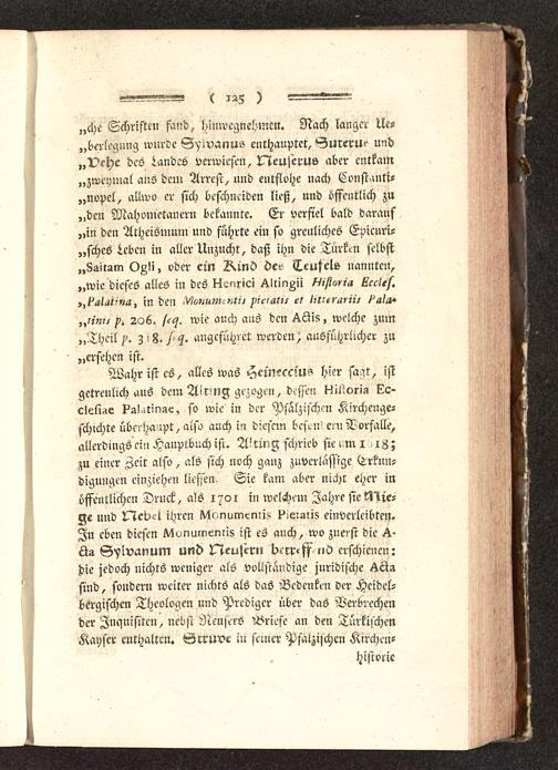 Wahr ist es, alles was Hein-cciu? k)-cr saqr, istgetreulich aus dem Air^ng gezogen, dcssen l-jil'.oria Kc-clesi^e ?a!.tinze, so wie in der Pfälzischen Kirchcnge-schichte übe: ha ipt, also auch in diesem bcseM eniTorfalle,allerdings ein Hauprbuch ist. A!ring schrieb sie um i iZ;zu einer Zeit also, als sich noch ganz zuverlässige Erkun-digungen einziehen liessen, Sie kam aber nicht eher inöffentlichen Druck, als 1701 in welchem Jahre sie stie-ge und !7leb--i ihren K1<.rwmcmi5 ?>ei2ljs einverleibten.In eben diesen lUunumenriz ist eS auch, wo zuerst die ^-G^>lvanum und Neujcrn berreff ->0 erschienen:die jedoch nichts weniger als vollständige juridischesind, sondern weiter nichts als das Bedenken der Heidel-bergischen Theologen und Prediger über das Verbrechender Inquisitcn, nebst NeujerS Briefe an den TürkischenKayser enthalten. Srruve in seiner Pfälzischen Kirchen-Historie