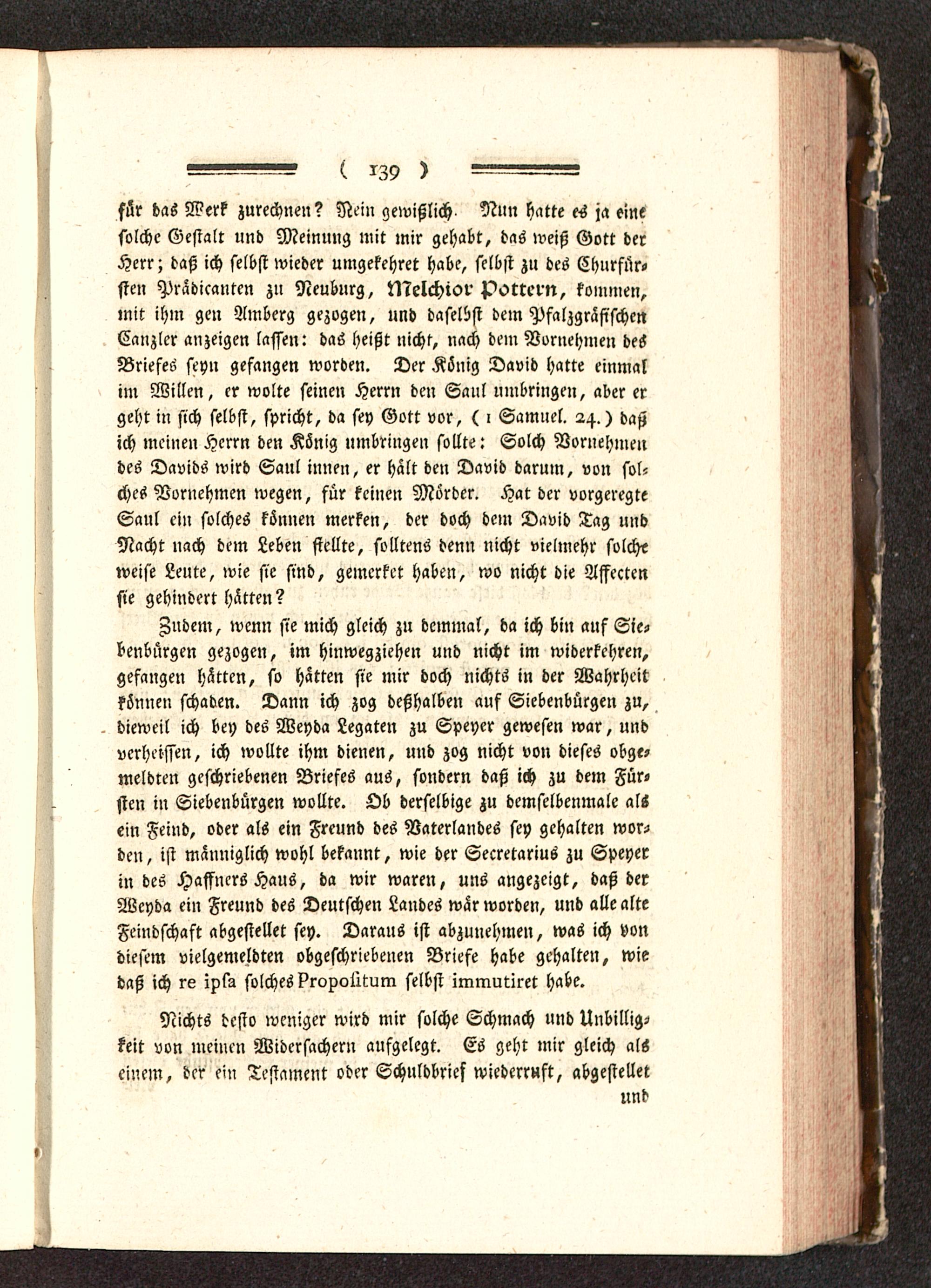Indem, wenn sie mich gleich zu Keinmal, da ich bin auf Sie-benbürgen gezogen, im hinwegzichen und nicht im widerkehren,gefangen hätten, so hatten sie mir doch nichts in der Wahrheitkönnen schaden. Dann ich zog deßhalben auf Siebenbürgen zu,dieweil ich bey des Weyda Legaten zu Speycr gewesen war, undverheißen, ich wollte ihm dienen, und zog nicht von dieses obge-meldren geschriebenen Briefes aus, sondern daß ich zu dem Für-sten in Siebenbürgen wollte. Ob derselbige zu demselbenmale alsein Feind, oder als ein Freund des Vaterlandes sey gehalten wor-den, ist mauniglich wohl bekannt, wie der Secretarius zu Speyer in des Haffncrs Haus, da wir waren, uns angezeigt, daß derWeyda ein Freund des Deutschen Landes wär worden, und alle alteFeindschaft abgestellet sey. Daraus ist abzunehmen, was ich vondiesem vielgemeldten obgeschriebenen Briefe habe gehalten, wiedaß ich re ipls solches?roxoütum selbst immutiret habe.