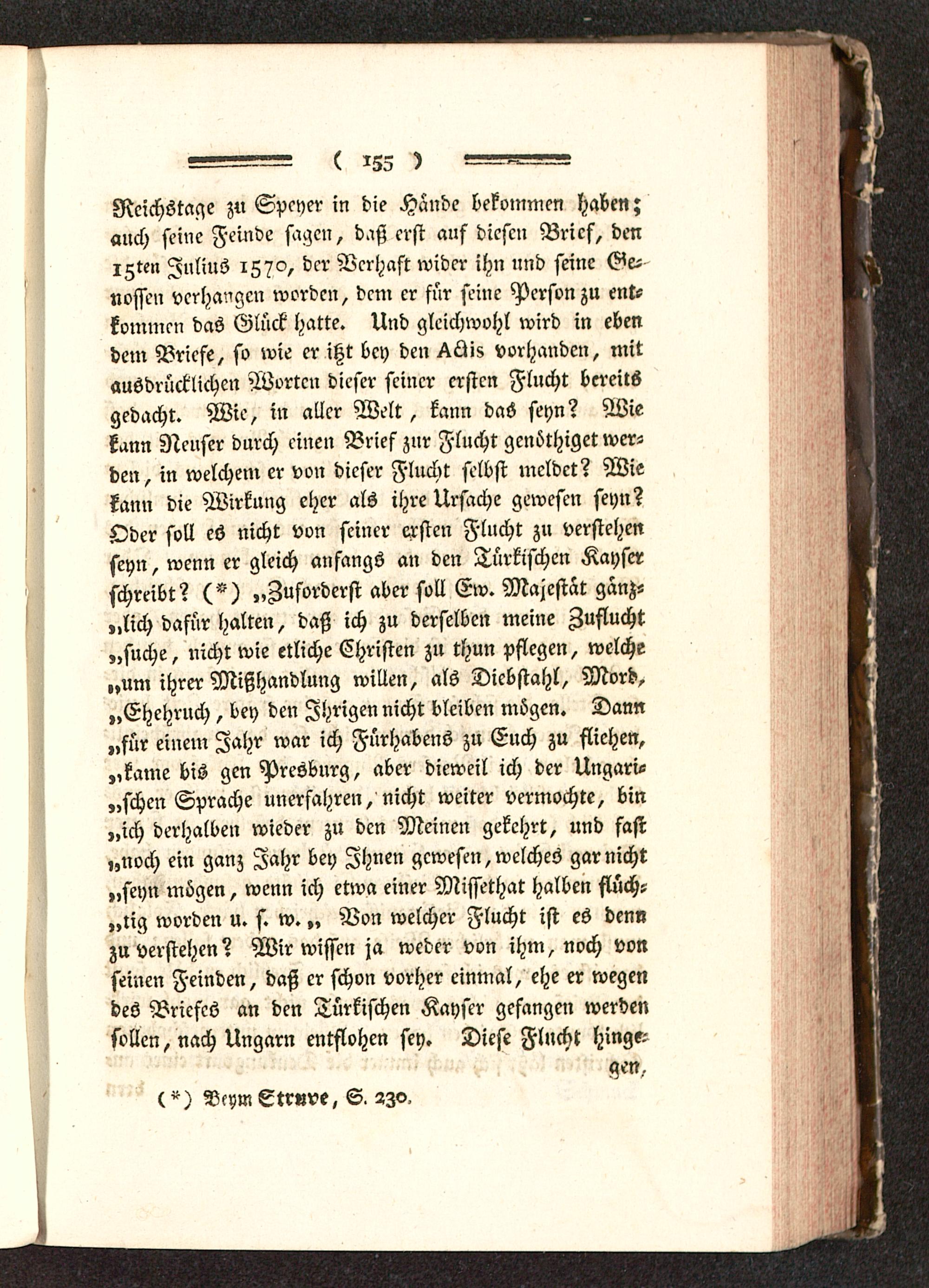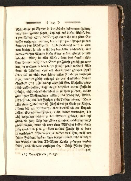 Reichstage zu Speyer in die Hände bekommen haben;auch seine Feinde sagen, daß erst ans diesen Brief, deniZten Julius 1570, der Verhaft wider ihn und seine Ge-nossen verhangen worden, dem er für seine Person zu ent-kommen das Glück hatte. Und gleichwohl wird in ebendem Briefe, so wie er itzt bey den vorhanden, mitausdrücklichen Worten dieser seiner ersten Flucht bereitsgedacht. Wie, in aller Welt, kann daS seyn? Wiekann Neuser durch einen Brief zur Flucht genöthiget wer-den, in welchem er von dieser Flucht selbst meldet? Wiekann die Wirkung eher als ihre Ursache gewesen seyn?Oder soll eö nicht von seiner ersten Flucht zu verstehenseyn, wenn er gleich anfangs an den Türkischen Kayserschreibt? (^) „Anforderst aber soll Ew. Majestät gänz-lich dafür halten, daß ich zu derselben meine Zuflucht„suche, nicht wie etliche Christen zu thun pflegen, welche„um ihrer Mißhandlung willen, als Dicbstahl, Mord,„Ehehruch, bey den Ihrigen nicht bleiben mögen. Dann„für einem Zahr war ich Fürhabens zu Euch zu fliehen,„käme bis gen Presbnrg, aber dieweil ich der Ungari-„schen Sprache unerfahren, nicht weiter vermochte, bin„ich derhalben wieder zu den Meinen gekehrt, und fast„noch ein ganz Jahr bey Ihnen gewesen,welches garnicht„seyn mögen, wenn ich etwa einer Missethat halben flüch-tig worden u. s. w.», Von welcher Flucht ist es dennzu verstehen? Wir wissen ja weder von ihm, noch vonseinen Feinden, daß er schon vorher einmal, ehe er wegendes Briefes an den Türkischen Kayser gefangen werdensollen, nach Ungarn entflohen sey. Diese Flucht hinge-gen,