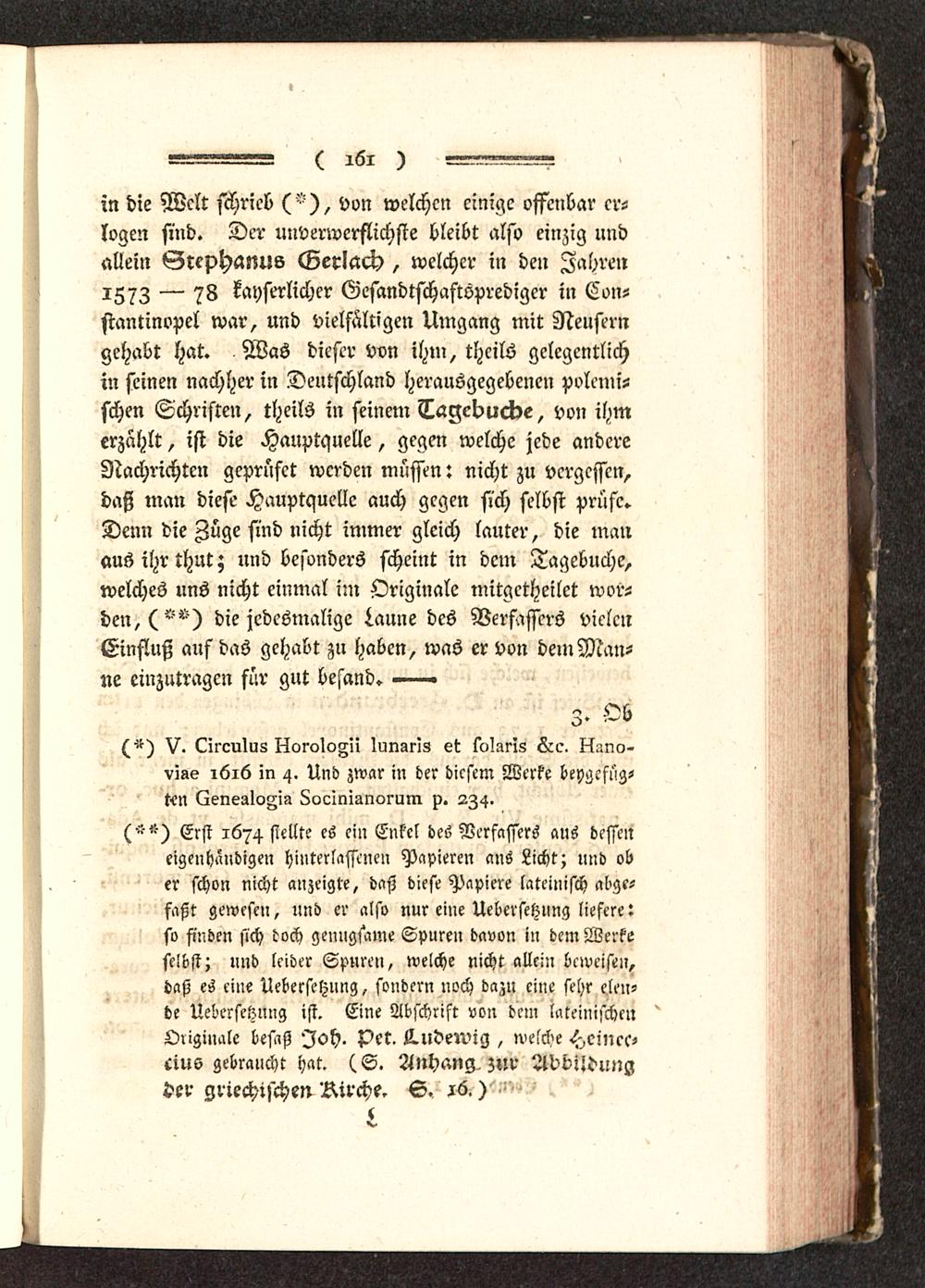 in die Welt schrieb (^), von welchen einige offenbar er-logen sind. Der unverwerflichste bleibt also einzig nndallein Grcphanus Gerlach, welcher in den Jahren— 78 kayserlicher Gesandtschaflöprediger in Con-stantinopel war, und vielfältigen Umgang mit Neuserngehabt hat. Was dieser von ihm, theils gelegentlichin seinen nachher in Deutschland herausgegebenen polemi-schen Schriften, theils in seinem Tagcbucbe, von ihmerzählt, ist die Hauptquelle, gegen welche jede andereNachrichten geprüfct werden müssen: nicht zu vergessen,daß man diese Hauptquelle auch gegen sich selbst prüfe.Denn die Auge sind nicht immer gleich lauter, die manaus ihr thut; und besonders scheint in dem Tagebuche,welches uns nicht einmal im Originale mitgetheilet wor-den, ('^) die jedesmalige Laune des Verfassers vielenEinfluß auf das gehabt zu haben, was er von dem Man-ne einzutragen für gut befand» —-