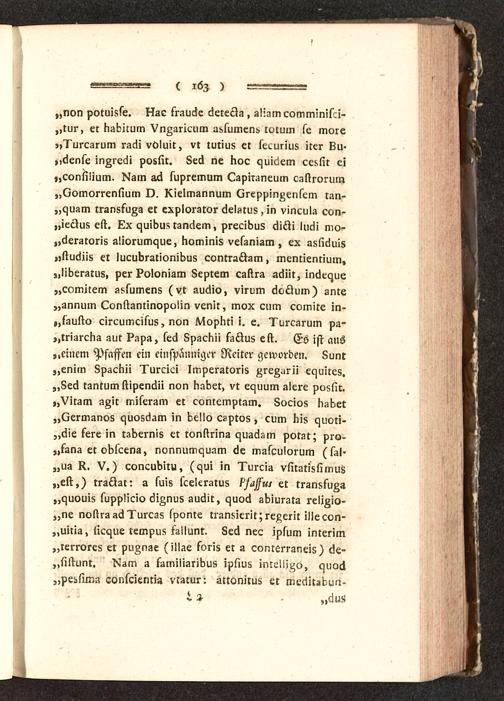 „non potul8se. Hac sr.iu6c cjereZg, slizm comminisci-„tur, er nabimm Vngaricum ui-lumen!, lotum se more-»l'urcgrum rsöi voluit, vt tutius et securius iter Ku-».o'enle inZiecii poslit. 8e6 ne noc quiciem ce!>l!t ei„conliüum. >1am »6 supremum Lapmineum c-ilirorum„(Zomorrenlium I). Xielmsnnum (Zreppin^ensem r.in-„emsm lrsnsfugg er exploraror 6el«tus »in vincula con»„ieÄus eir. Lx quibu5 tgnciem, precikus c>!6ti lucli mo.-„äersroris sliorumczue, Kominis vesanism, ex ssliciuis„ltuciiis el iucubrsrionivus contrs^sm, menlienrium,„liberarus, per kolonism 8eptem caltra acliit, in^eczue„comitem s^sumens (vt auciio, virvm ^oüum) ante„annum Lonltanlinopoün venir, mox cum comire in-,,lizulto circumcisus, non /vsopnt! !. e. I'urcnrum pa-,,rr!arcna aut ?apa, le6 8pacmi fsüus elt. Es ist aus,.einem Pfaffen ein einspänniger Reiter geworden. Lunr„enim 8pscnii l'urcici Imperatoris ^regurii e^uires.„8eci tantum liipenäii non nadet, vt e^uuin alere poslir.„Viram sZir mileram er contemptam. 8ocios KaKet„(Zermanos quogcjam in dello csptos, cum nis czuoti»,,6ie tere in tskernis er ronltrins czua^Lin potst; pro-„5ana et ovlcens, nonnumc^uam cje malcrilorum„ua V.) concubiru, (qui in l'urcia vlitgt!slimu8„elt,) traüat: s luis lcelcratu8 ^/»/ et trsnsfuZa„czuouis iuppücio cüZnus au6it, quoc! stziuratg rcli^io-„ne noltra»61'urcZ5 sponte transierit;reßerit illecon-„uiliz, tic^ue tempus isilunt. 8ecl nec ivlum interim„rerrore8 et vuAnse (illae soris er s contsrrgneis) <ie»,,sil^i.int. I^Iam s samiiiariku« iplius inrclÜ^o, czuocl„pel-üm.^ eonscienriÄ vtsrur: ültonitus et MLciirsbun.