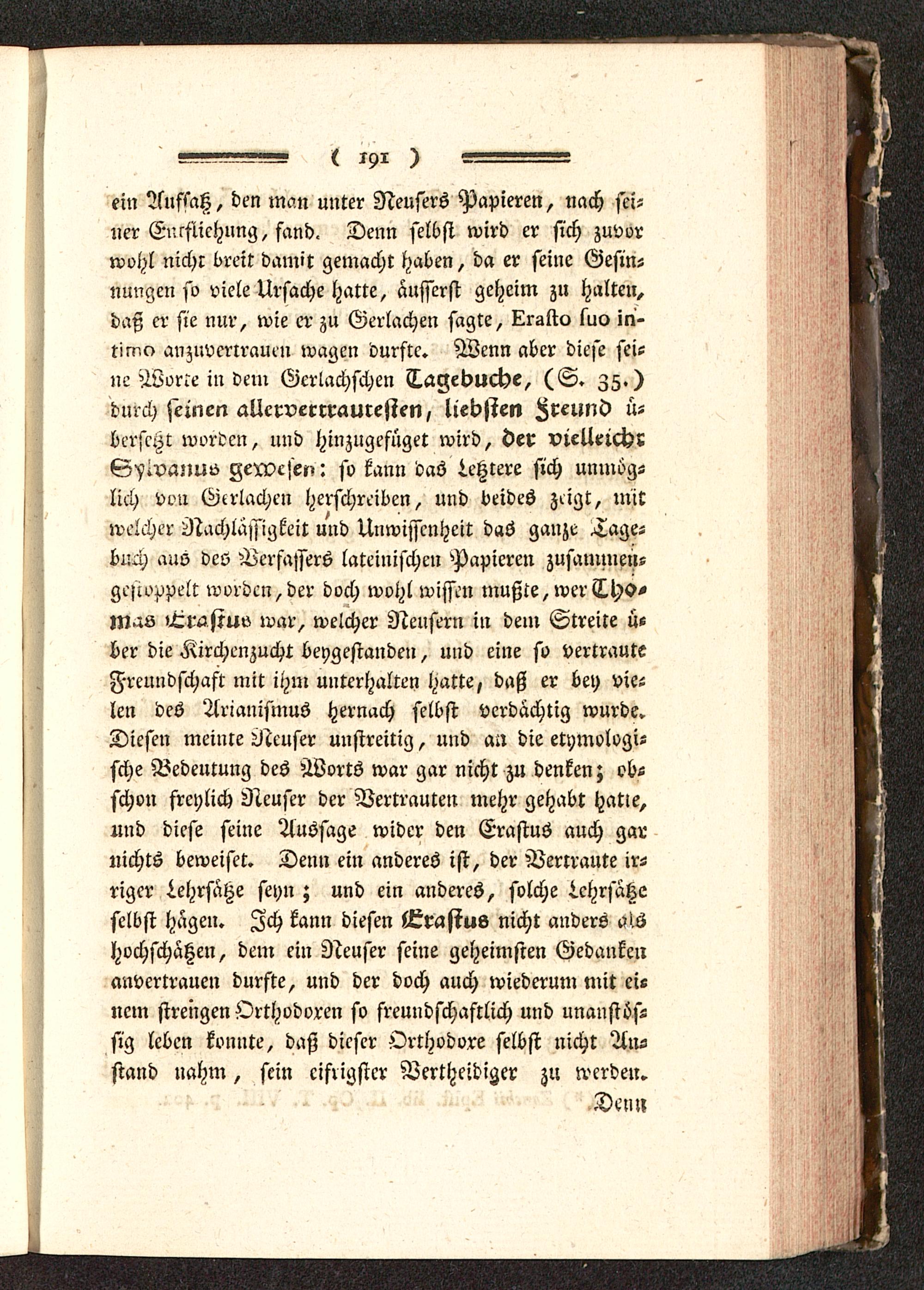 ein Aussatz, den man unter Neusers Papieren, nach sei-ner Euislichung, fand. Denn selbst wird er sich zuvvrwohl nichr breit bannt gemacht haben, da er seine Gesin-nungen so viele Ursache hatte, äusserst geheim zu halten,daß er sie nur, wie er zu Gerlachen sagte, Lrslio luv in-timc> anzuvertrauen wagen durste. Wenn aber diese sei-ne Worte in dem Gcrlachschen Tagebuche, (S. zz.)durch seinen allcrvecrrauresten, liebsten Freund ü-bcrsetzt worden, und hinzugefüget wird, der vielleicHrGywanuü geLvcfen: so kann das Letztere sich unmög-lich von Gcrlachen herschreiben, und beides zcigt, mitwelcher Nachlässigkeit und Unwissenheit das ganze Tage-buch aus des Verfassers lateinischen Papieren zusammen-gestöppelt worden, der doch wohl wissen mußte, wer Tho-mas ^rastuv war, welcher Neusern in dem Streite ü«ber die Kirchenzucht beygestanden, und eine so vertrauteFreundschaft mit ihm unterhalten hatte, daß er bey vie-len des Arianismus hernach selbst verdachtig wurde.Diesen meinte Neuser unstreitig, und all die etymologi-sche Bedeutung des Worts war gar nicht zu denken; ob-schon freylich Neuser der Vertrauten mehr gehabt hatte,und diese seine Aussage wider den ErastuS auch garnichts beweiset. Denn ein anderes ist, der Bertraute ir-riger Lehrsätze seyn; und ein anderes, solche Lehrsätzeselbst Hagen . Ich kann diesen lLrasius nicht anders alshochschätzen, dem ein Neuser seine geheimsten Gedankenanvertrauen durfte, und der doch auch wiederum mit ei-nem strengen Orthodoxen so freundschaftlich und unanstös-sig leben konnte, daß dieser Orthodoxe selbst nicht An-stand nahm, sein eifrigster Vertheidiger zu werden.