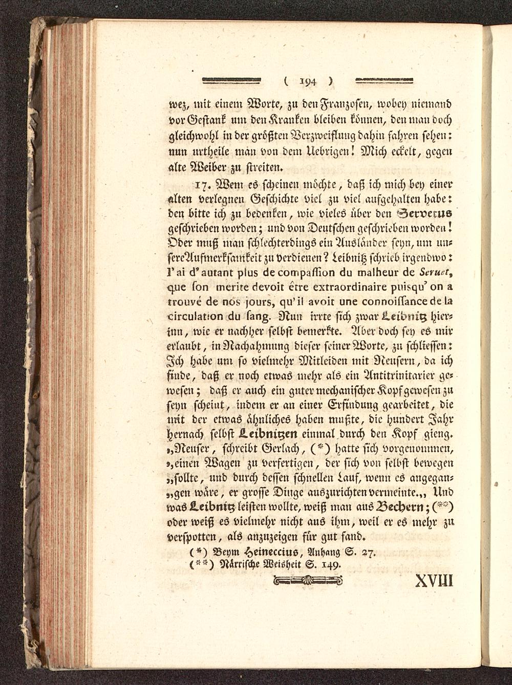17. Wem es scheinen möchte, daß ich mich bey eineralten verlegnen Geschichte viel zu viel aufgehalten habe:den bitte ich zu beoenken, wie vieles über den Zervecusgeschrieben worden; und von Deutschen geschrieben worden!Oder muß man schlechterdings ein'Ausländer seyn, um un-sercAufmcrksamkeit zu Verdienen? ^eibnitz schrieb irgendwo:I'ai 6'JUlgnt plu8 cle compgilion 6u malkeur 6e 5^«-/',H.ue lon merice clevoir erre extrsorclingire pM5Hu'on strouve 6e no^ jourg, qu'il avc>ir une connoillance ele lscirculat-on ciu sgnZ. Nun irrte sich zwar l!.eibniy hier-inn, wie er nachher selbst bemerkte. Aber doch sey cö mirerlaubt, in Nachahmung dieser seiner Worte, zuschließen:Ich habe um so vielmehr Mitleiden mit Neusern, da ichfinde, daß er noch etwas mehr als ein Antitrinitarier ge-wesen ; daß er auch ein guter mechanischer Kopf gewesen zuseyn scheint, indem er an einer Erfindung gearbeitet, diemit der etwas ähnliches haben mußte, die hundert Jahrhernach selbst L.eibmyen einmal durch den Kopf gicng.,,Neuser, schreibt Gcrlach, (^) hatte sich vorgenommen,einen Wagen zu verfertigen, der sich von selbst bewegen„sollte, und durch dessen schnellen 5auf, wenn es angegan-„gcn wäre, er grosse Dinge auszurichten vermeinte.,, Undwas L.eibnty leisten wollte, weiß man auS Bechern; ('^)oder weiß es vielmehr nicht aus ihm, weil er es mehr zu.verspotten, als anzuzeigen für gut fand.