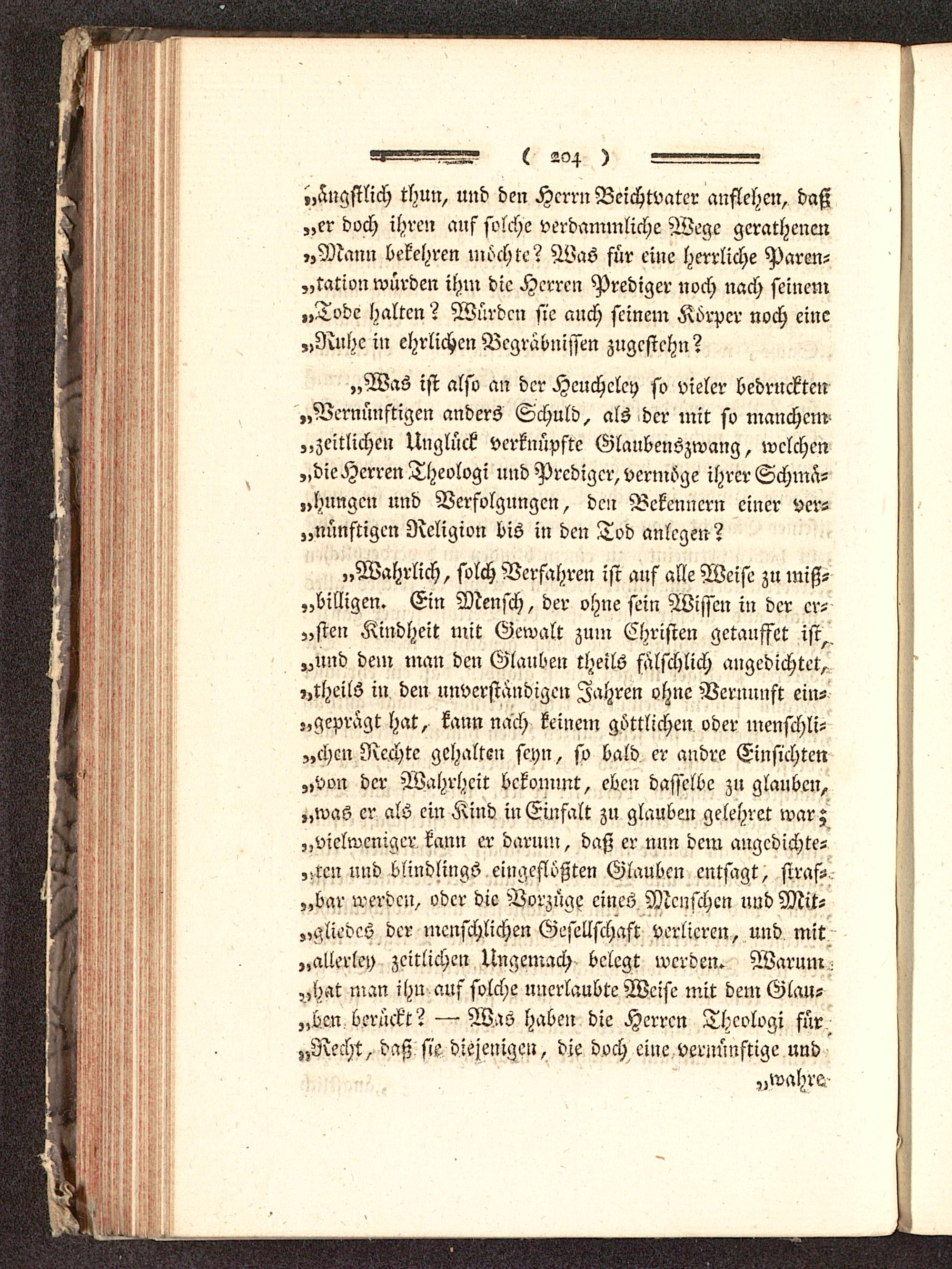 „Was ist also an der Heuchelet) so vieler bedruckten„Vernünftigen anders Schuld, als der mit so manchem„zeitlichen Unglück verknüpfte Glaubenszwang, welchen„dieHerren Theologi und Prediger, vermöge ihrer Schmä-hungen und Verfolgungen, den Bekenncrn einer ver-nünftigen Religion bis in den Tod anlegen ?