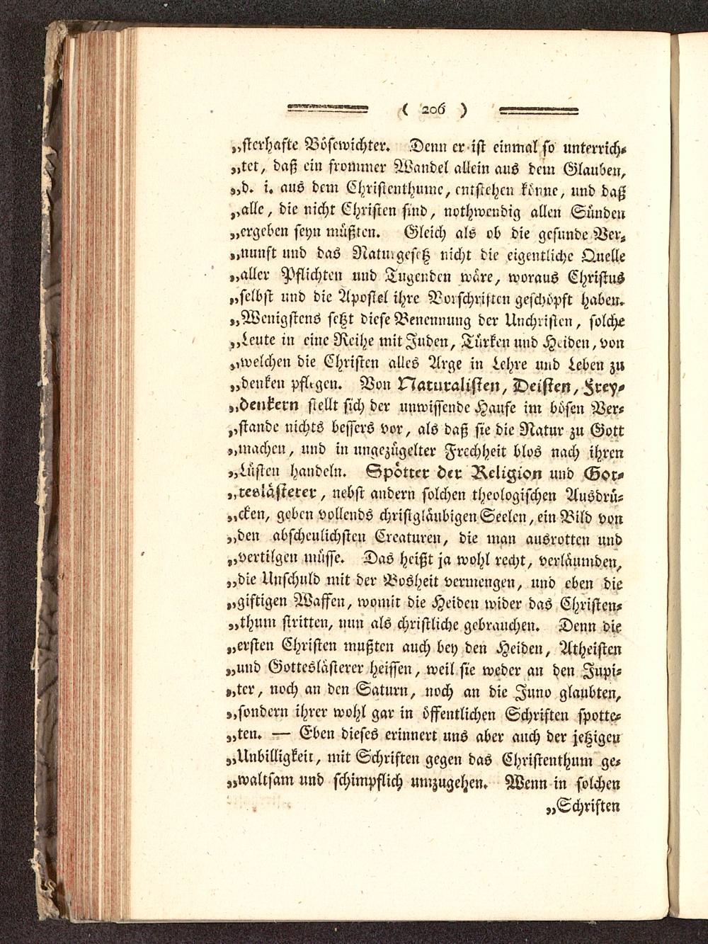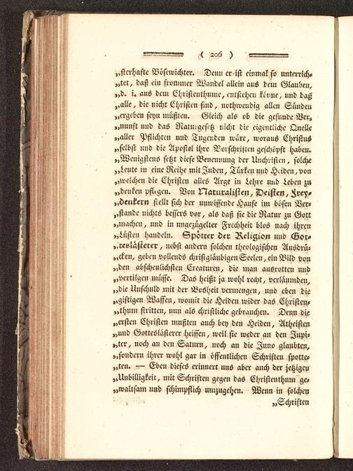 „stcrhafte Vöscwichter. Denn er ist einmal so unterrich-„tct, daß ein frvnuncr Wandel allein aus dem Glauben,„d. i. aus dem Chrisicnlhumc, entstcheu könne, und daßalle, die nicht Christen sind, nothwendig allen Sünden„ergeben seyn müßten. Gleich als ob die gesunde Ver-nunft und das Nattugesitz nicht die eigentliche Quelle„aller Pflichten und Tugenden wäre, woraus Christus„selbst und die Apostel ihre Vmschrislen geschöpft haben.„Wenigstens setzt diese Benennung der Unchnsteu, solche„Leute in eine Reihe mit Juden, Türken und H.idcn,von,,welchen die Christen alles Arge in Lehre und Leben zu„denken pflegen. Von Naturalisten, Deisten, Hrcy-„deukcrn stellt sich der unwissende Haufe im bösen Ver-sande nichts besscrs vor, als daß sie die Natur zu Gott„machen, uud in ungezügelter Frechheit blos nach ihren„Lüsten handeln. Gpötrcr der Religion und Gor-„revläjteccr, nebst andern solchen theologischen Ausdrü-cken, geben vollends christglaubigcn Seelen, ein Bild von„den abscheulichste» Creaturen, die man ausrotten und„vertilgen müsse. Das heißt ja wohl recht, vcrla'umden,„die Unschuld mit der Bosheit vermengen, und eben die„giftigen Waffen, womit die Heiden wider das Christen-„thum stritten, nun als christliche gebrauchen. Denn die„ersten Christen mußten auch bey den Heiden, Atheisten„und Gotteslästerer heissen, weil sie weder an den Jupi-»,tcr, noch an den Saturn, noch an die Zuno glaubten,„sondern ihrer wohl gar in öffentlichen Schriften spotte-ten. — Eben dieses erinnert uns aber auch der jetzigen„Unbilligkeir, mit Schriften gegen das Christenthum ge-waltsam und schimpflich umzugehen. Wenn in solchen