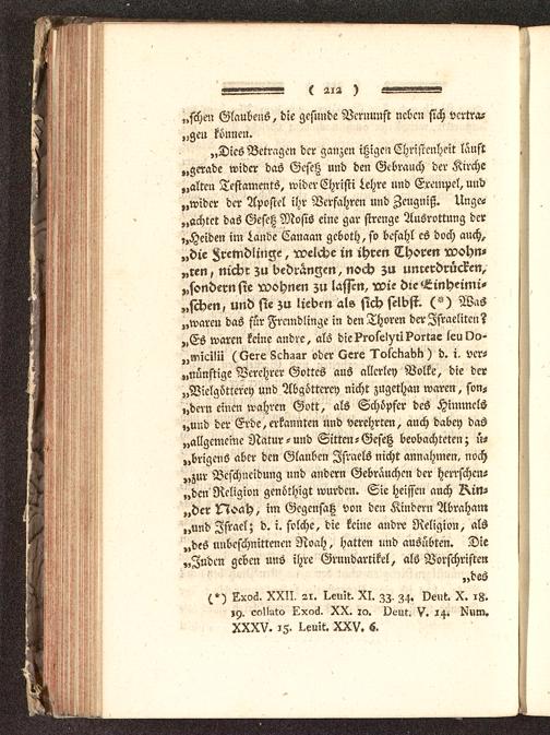 „Dies Betragen der ganzen ißigen Christenheit lauft„gerade wider das Gesetz und den Gebrauch der Kirche„alten Testaments, wider Christi Lehre und Exempel, und„wider der Apostel ihr Versahren und Zeugniß. Unge-achtet das Gesetz Most's eine gar strenge Ausrottung der,,Heiden im Lande Canaan geboth, so befahl es doch auch,„die Fremdlinge, voelche in ihren Thoren rvohn-„ren, nickr zu bedrängen, noch zu unterdrücken,„sondernste Wohnen zu lasten, nie die«Linheimi-„schen, und sie zu lieben als sich selbst. (^) Was„waren das für Fremdlinge in den Thoren derJsraelitcn?„Es waren keine andre, als die?rosel^li?ort2e leuOo-„micilii (Lere 8cKaar oder Lere ^oickalzk) d. i. ver-nünftige Verehrer Gottes aus allerley Volke, die der„Viclgötterey und Abgötterei) nicht zugethan waren, son-„dern einen wahren Gott, als Schöpfer des Himmels,,und der Erde, erkannten und verehrten, auch dabey das„allgemeine Natur - und Sitten-Gesetz beobachteten; ü-„brigcns aber den Glauben Israels nicht annahmen, noch„zur Bcschncidung und andern Gebräuchen der herrschen-den Religion genöthigt wurden. Sie heissen auch AiN-„der !7!oah, im Gegensatz von den Kindern Abraham„und Israel; d. i. solche, die keine andre Religion, als„des unbcschnittenen Noah, hatten und ausübten. Die„Juden geben uns ihre Grundarrikel, als Vorschriften